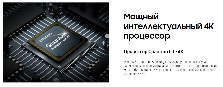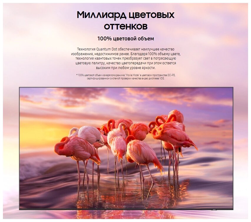 Технология Quantum Dot обеспечивает наилучшее качество изображения, недостижимое ранее. Благодаря 100% объему цвета, технология квантовых точек преобразует свет в потрясающую цветовую палитру, качество цветопередачи при этом остается высоким при любом уровне яркости. Инновационная технология подсветки обеспечивает более четкую и точную контрастность за счет оптимизации цветового тона подсветки в соответствии с типом просматриваемого контента. Технология Quantum HDR позволяет выявить мельчайшие детали изображения и обеспечить оптимальную контрастность, чтобы вы получили максимальное удовольствие от просмотра каждой сцены. Благодаря увеличенному диапазону яркости экрана вашего телевизора, вы сможете оценить все богатство цветовой палитры и великолепную видимость деталей даже в самых темных и светлых сценах. Мощный процессор Samsung оптимизирует качество звука в зависимости от просматриваемого контента. Благодаря технологии масштабирования до 4K, вы сможете смотреть любимый контент в разрешении 4К.