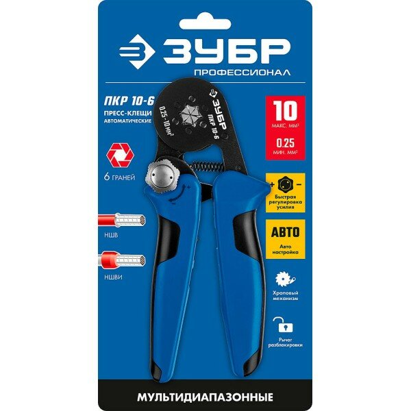 ЗУБР ПКР-10-6 0.25-10мм2 с шестигранным профилем для втулочных наконечников, Мультидиапазонные пресс-клещи, Профессионал (22678)