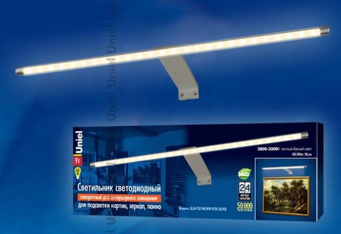 Подсветка для картин светодиодная ULM-F32-9W/WW IP20 SILVER картон - продукт известной компании Uniel (Китай). Имеет максимальную мощность 9 Вт, освещает площадь до 2 кв. м. Отлично подойдет для таких мест, как гостиная, кафе, кабинет, офис, экспозиция, магазин. Впишется в интерьеры следующих стилей: современный.