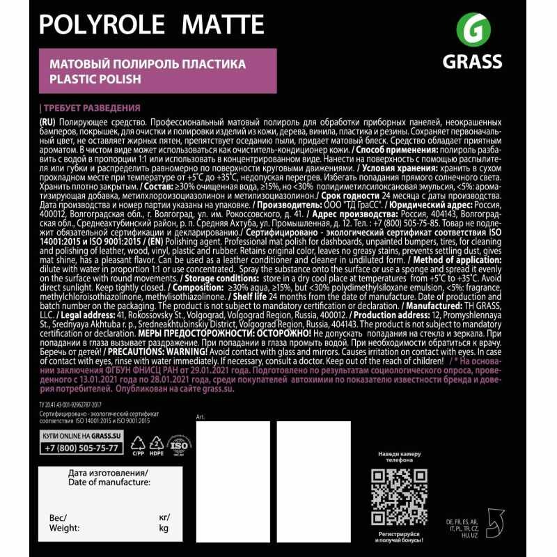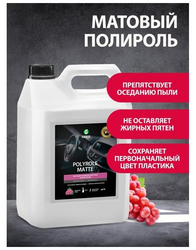 **Полироль пластика Grass Виноград** — профессиональное средство с матовым эффектом. Предназначено для обработки панелей, чистки, полировки изделий из кожи, дерева, винила, пластика, резины. Не оставляет жирных пятен, препятствует оседанию пыли, придает поверхности приятный, легкий блеск. Отличается сдержанным ароматом.