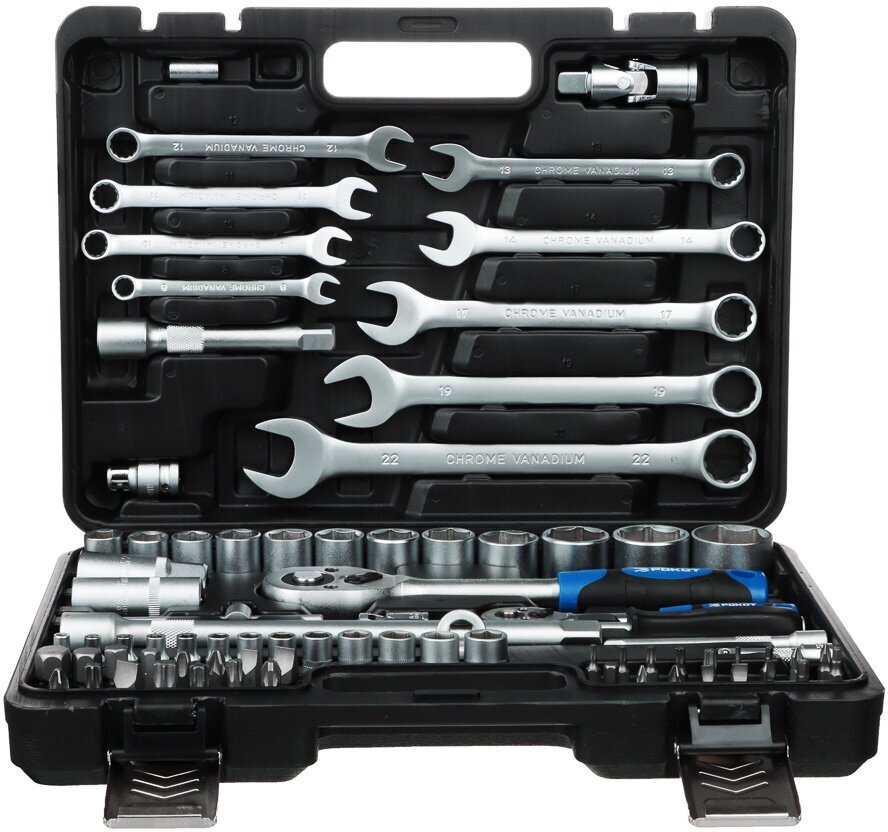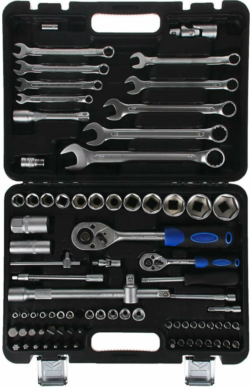 Необходимы инструменты для проведения текущего ремонта автомобиля? Набор автомобильных инструментов РОКОТ из 83 предметов включает в себя все самое необходимое: отвертки, гаечные ключи, набор бит с держателями, удлинители торцовых головок и многое другое. Все предметы изготовлены из качественной прочной закаленной стали, что гарантирует долгий срок службы. Удобный кейс надежно закрывается на замки и имеет ручку для переноски. Его можно компактно хранить как в гараже, так и в автомобиле.