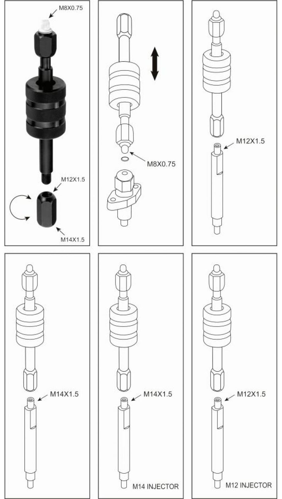 Съемник предназначен для снятия дизельных форсунок Bosch и Lucas методом обратного удара. Адаптеры: М8, М12, М14.