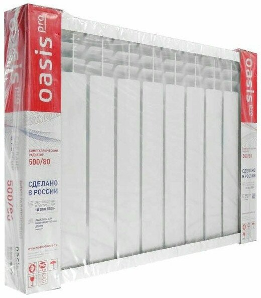 Биметаллические радиаторы предназначены для отопления многоэтажных домов. В этих радиаторах секция выполнена из стального вертикального и горизонтального коллектора. Конструкция полностью исключает контакт теплоносителя с алюминиевым корпусом. Сочетание алюминиевого «корпуса» и стального «сердечника» позволяет прибору отличаться особой прочностью и долговечностью. Благодаря этой технологии прибор максимально устойчив к воздействию избыточного давления при гидравлических ударах в системах отопления. Особый дизайн, вертикальные и горизонтальные ребра биметаллического радиатора улучшают проход воздуха, что увеличивает теплоотдачу. Радиатор отопления биметаллический Оазис Pro произведён и сертифицирован на территории Российской Федерации. Гарантия от производителя при соблюдении всех правил 20 лет. Перед отправкой радиаторы для отопления тщательно проверяются на наличие сколов, трещин и делается опрессовка для защиты от протекания.