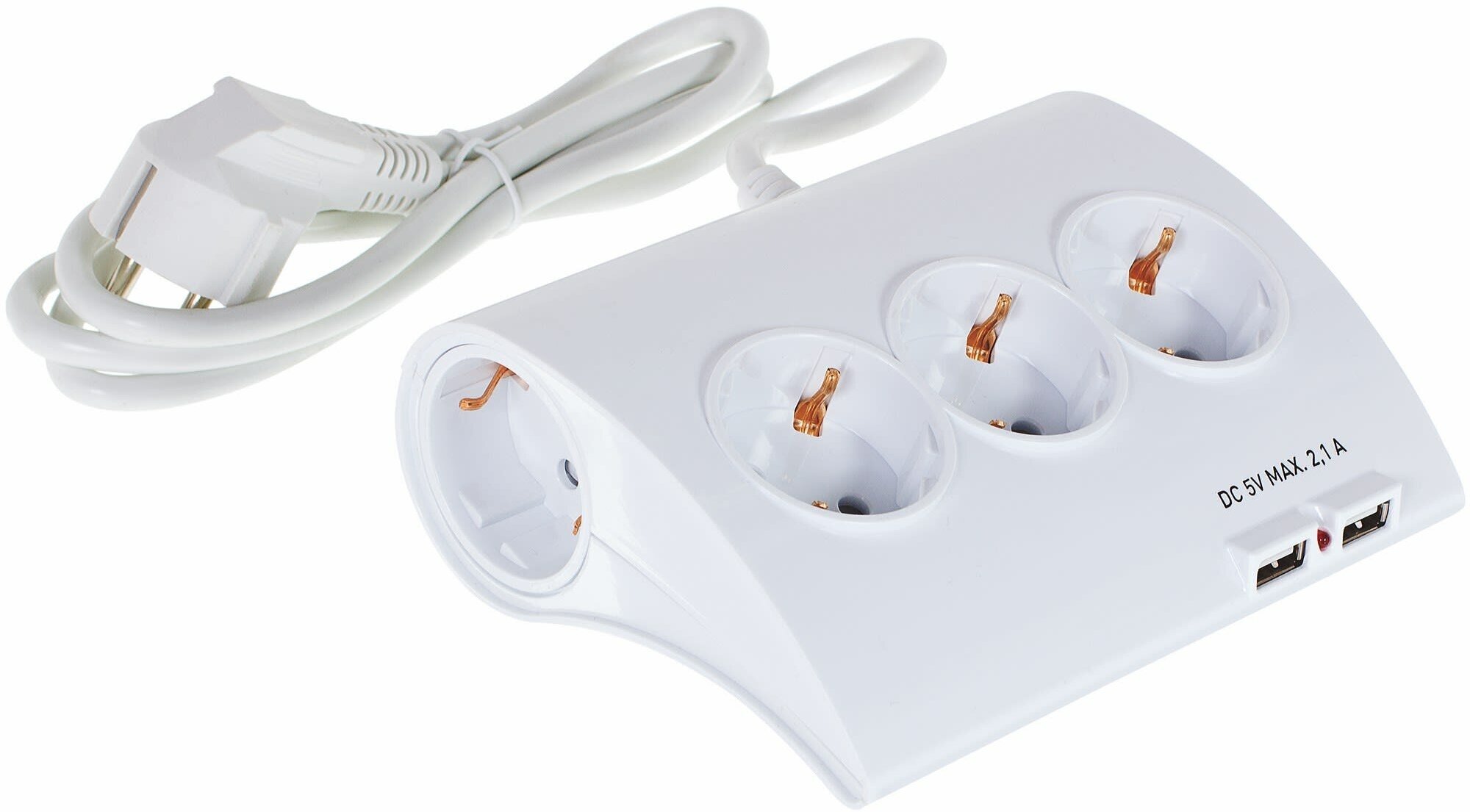 Компактный удлинитель для одновременного подключения 5-ти бытовых устройств и 2-х мобильных гаджетов через USB-разъемы. Имеет стильный дизайн и нестандартное расположение сетевых гнезд. Розетки на сетевом удлинителе расположены оригинально: три гнезда занимают фронтальную часть, да остальных разнесены по бокам. Такое решение делает электроприбор малогабаритным и удобным для размещения в ограниченном пространстве. Удлинитель имеет два USB-разъема с выходным суммарным током 2,1А. Оптимально для подзарядки мобильных телефонов и маломощных переносных гаджетов. Корпус удлинителя неразборный, выполнен из высокопрочного поликарбоната. Электроприбор оснащен заземлением для безопасной эксплуатации, защищая пользователей от поражения электрическим током. Встроенный сетевой предохранитель автоматически обесточит удлинитель в случае чрезмерной нагрузки на сеть, превышающей допустимое значение в 3500 Вт.