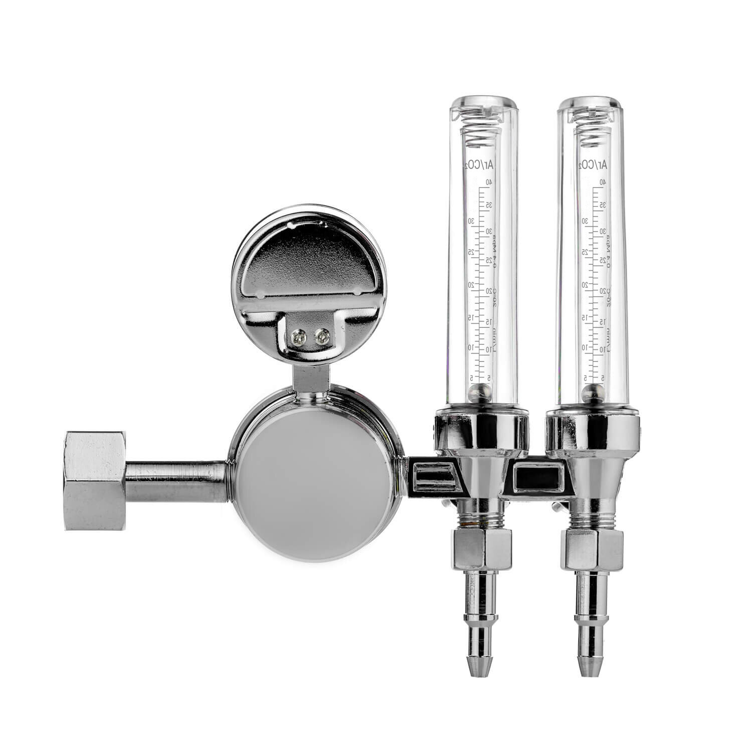 Универсальный регулятор расхода газа с двумя ротаметрами. Регулятор предназначен для углекислоты и аргона. Корпус регулятора изготовлен из латуни с никелированным покрытием. Поставляется в комплекте с универсальными ниппелями.
