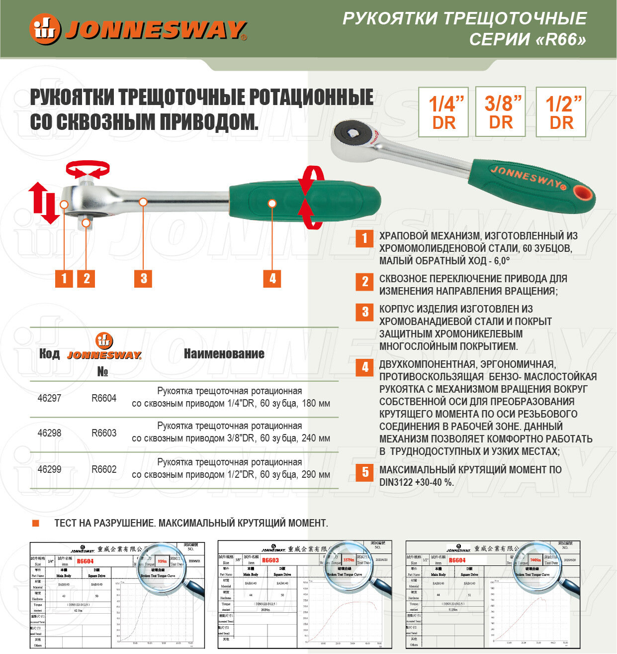 Трещоточная ротационная рукоятка Jonnesway R6604 — идеальный инструмент для работы с резьбовыми соединениями.Преимущества Прочность и долговечность: инструмент изготовлен из высококачественных материалов, таких как хромованадиевая сталь, что обеспечивает долгий срок службы и устойчивость к коррозии Удобство использования: эргономичная двухкомпонентная рукоятка обеспечивает надёжный захват и комфорт во время работы, а также устойчива к маслам, бензину и другим техническим жидкостям Широкий спектр применения: трещоточная рукоятка подходит для работы с резьбовыми соединениями разных размеров и типов благодаря своему сквозному приводу и храповому механизму с 60 зубцами