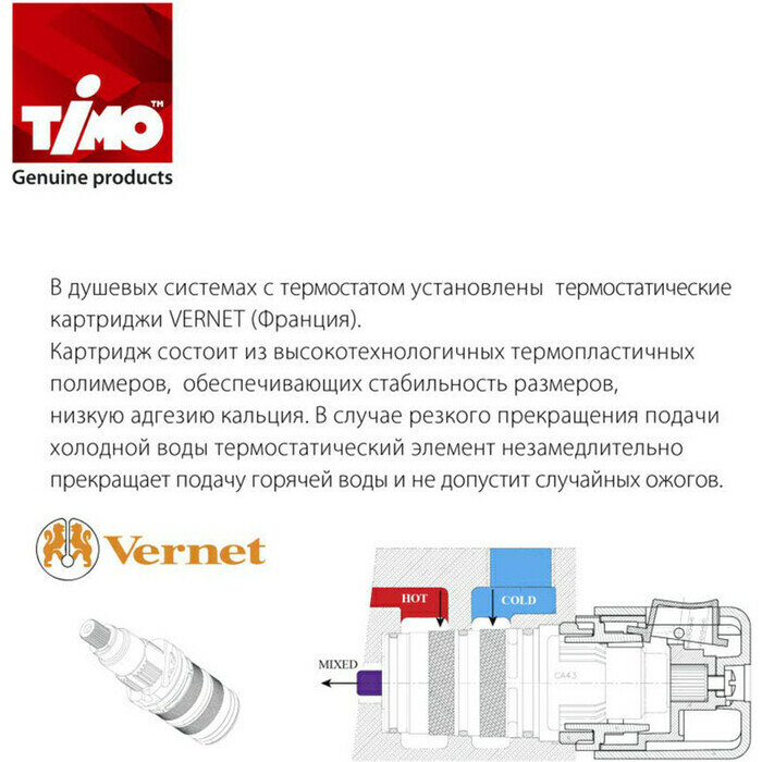 Финские смесители Timo обладают сертификатами качества. А также специальными гигиеническими сертификатами и гарантией сроком на 5 лет. Смесители изготавливаются из латуни и покрываются в три слоя хромовым напылением, что обеспечивает их долговечность, при этом не изменяя своей первоначальной красоты. Помимо того, смесители Timo легко переносят повышенную влажность и перепады температуры. Все детали такого смесителя смазываются специальным составом, которое препятствует их износу. Модели все бесшумны и оснащены керамическими картриджами. Вся продукция тестируется на соответствие требованиям эксплуатации.