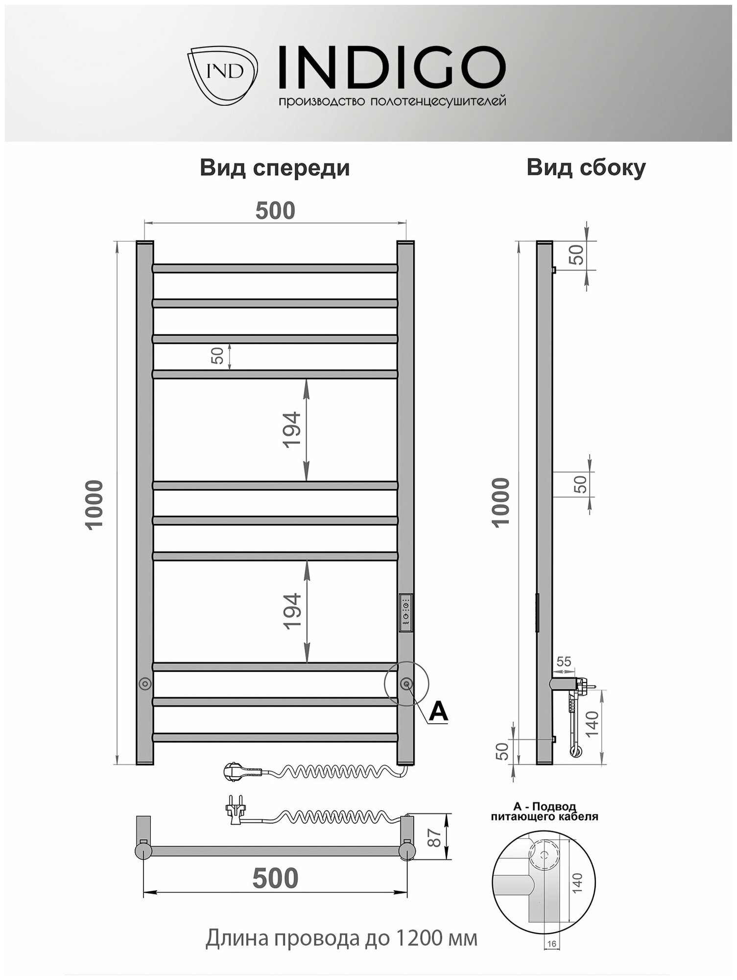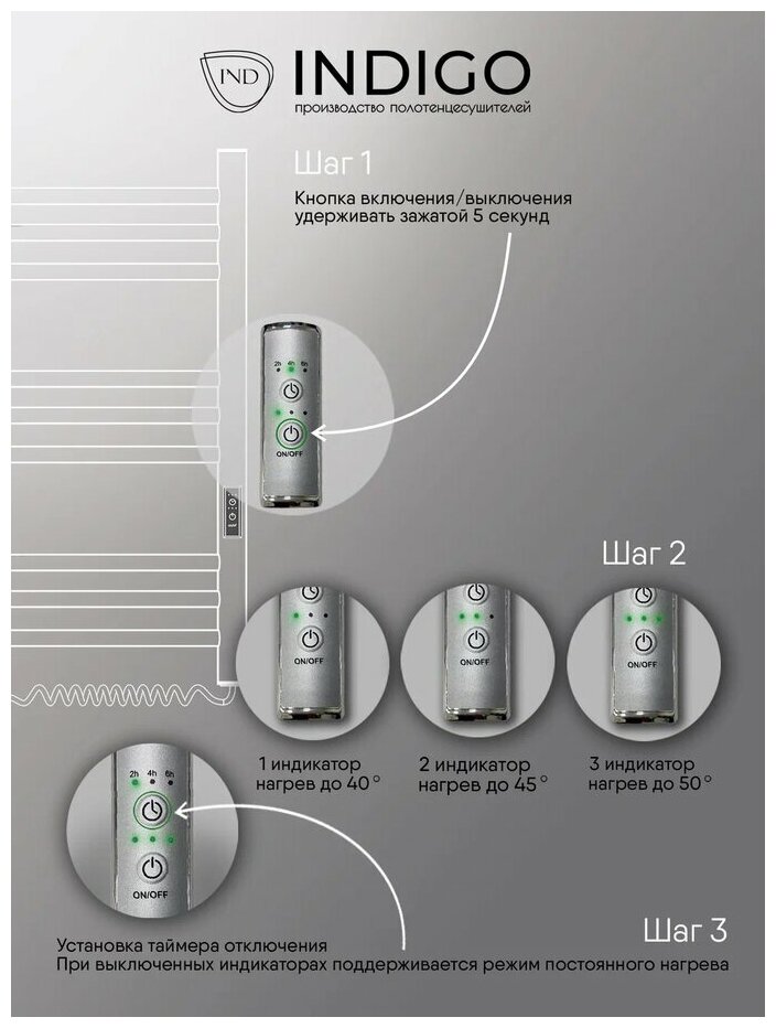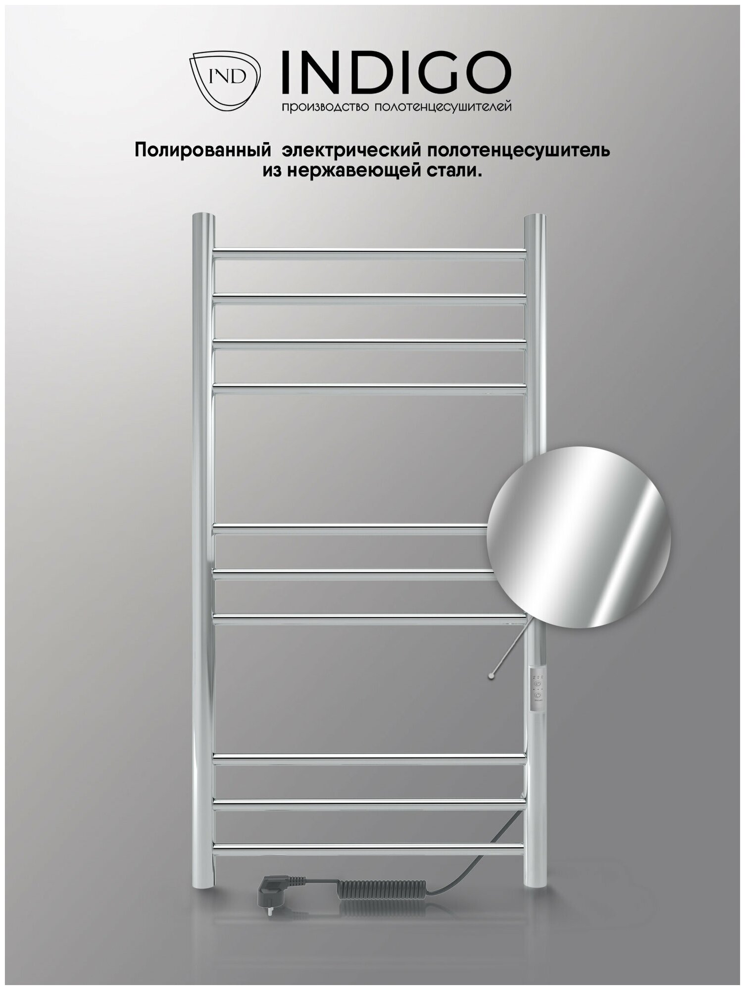 Полотенцесушитель электрический INDIGO Trinity в размере 1000х500 (ВхШ) выбирают за его технологичность и универсальность. Модель оснащена терморегулятором нагрева, у которого три режима: 40, 45, 50 градусов и таймером на отключение через 2, 4, 6 часов. Универсальность изделия предусматривает подключение через провод, который переставляется на нужную вам сторону или скрытое подключение без покупки дополнительного переходника. Длина провода 1,2 метра.Полотенцесушитель относится к энергоэффективным изделиям, потребляемая мощность в данном размере 140 Вт. Специальная технология нагревательного кабеля защищает полотенцесушитель от перегрева что влияет на длительные сроки службы. В комплектации идут 4 телескопических держателя, комплект для монтажа и гарантийный паспорт.Полотенцесушитель INDIGO Trinity застрахован и имеет гарантию 3 года. Выбирая INDIGO вы получаете надежный продукт из нержавеющей стали с гарантией качества от Российского производителя.