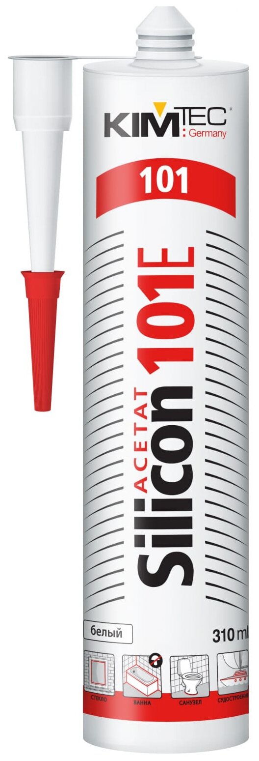 Силиконовый герметик KIM TEC белый 101Е 310мл Универсальный герметик предназначен для заделки швов, герметизации и склеивания сантехнического оборудования, витрин и оконных проемов. Подходит для использования в подвижных швах как внутри, так и снаружи помещений. Продукт используют во время ремонта и обслуживания судов или транспортных средств. Состав обладает высокой адгезией к дереву, ПВХ, пластмассе, стеклу, керамике, анодированному алюминию и окрашенным поверхностям без предварительного грунтования. Является защитным средством от развития бактерий и грибков благодаря ингибирующим добавкам.Отличительные свойства: эластичный, износостойкий, неогнеопасный, устойчивый к атмосферным воздействиям и УФ, сохраняет цвет.