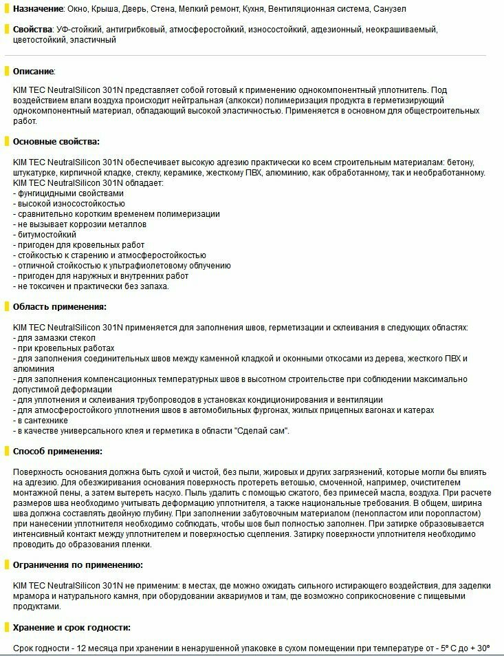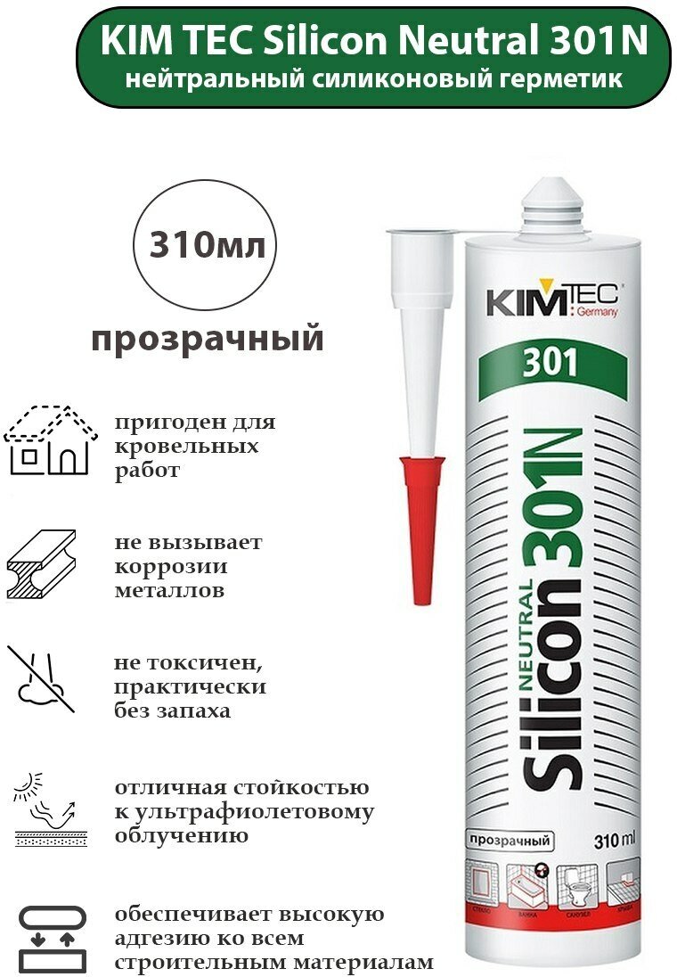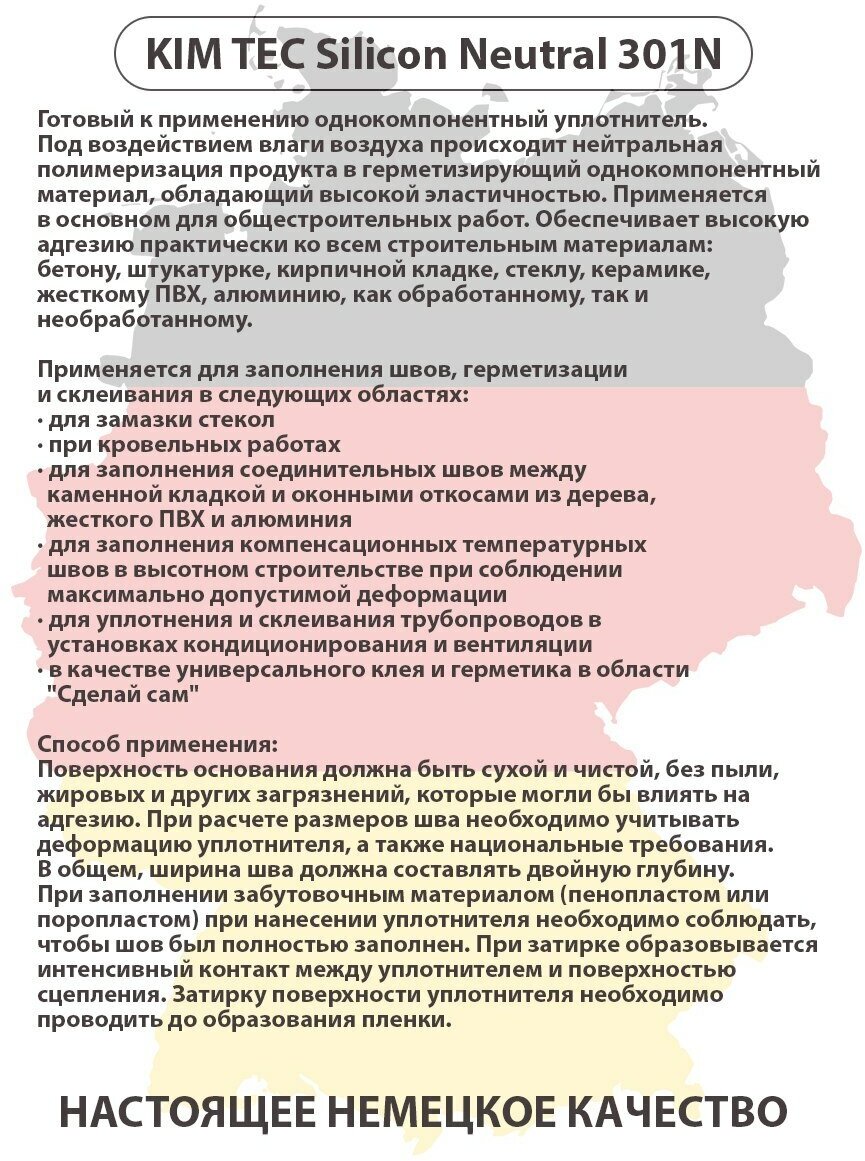 KIM TEC Neutral Silicon 301N представляет собой готовый к применению однокомпонентный уплотнитель. Применяется в основном для общестроительных работ. Под воздействием влаги воздуха происходит нейтральная (алкокси) полимеризация продукта в герметизирующий однокомпонентный материал, обладающий высокой эластичностью.Применение герметика KIM TEC Neutral Silicon 301N: для замазки стекол; при кровельных работах; для заполнения соединительных швов между каменной кладкой и оконными откосами из дерева, жесткого ПВХ и алюминия; для заполнения компенсационных температурных швов в высотном строительстве при соблюдении максимально допустимой деформации; для уплотнения и склеивания трубопроводов в установках кондиционирования и вентиляции для атмосферостойкого уплотнения швов в автомобильных фургонах, жилых прицепных вагонах и катерах; в сантехнике; в качестве универсального клея и герметика в области "Сделай сам".Ограничения по применению герметика: KIM TEC Silicon Neutral 301N не применим: в местах, где можно ожидать сильного истирающего воздействия, для заделки мрамора и натурального камня, при оборудовании аквариумов и там, где возможно соприкосновение c пищевыми продуктами.Свойства нейтрального герметика KIM TEC Neutral Silicon 301N: Высокая износостойкость; Сравнительно короткое время полимеризации; Не вызывает коррозии металлов; Битумостойкий; Пригоден для кровельных работ; Стойкий к старению и атмосферным явления; Стойкий к ультрафиолетовому облучению; Обладает фунгицидными свойствами; Пригоден для наружных и внутренних работ; Не токсичен и практически без запаха.Рекомендации по использованию: Поверхность основания должна быть сухой и чистой, без пыли, жировых и других загрязнений, которые могли бы влиять на адгезию. Для обезжиривания основания поверхность протереть ветошью, смоченной, например, очистителем монтажной пены, а затем вытереть насухо. Пыль удалить с помощью сжатого, без примесей масла, воздуха. При расчете размеров шва необходимо учитывать деформацию уплотнителя, а также национальные требования. В общем, ширина шва должна составлять двойную глубину. При нанесении уплотнителя необходимо соблюдать, чтобы шов был полностью заполнен. При затирке образовывается интенсивный контакт между уплотнителем и поверхностью сцепления. Затирку поверхности уплотнителя необходимо проводить до образования пленки.Цвет: белый, бесцветный.Упаковка: 310 мл.Хранение: 12 месяцев при хранении в ненарушенной упаковке в сухом помещении при температуре от -5ºC до +30ºC.