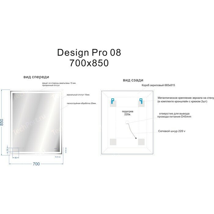 | Функции | Антизапотевание / Подсветка / Сенсорный выключатель / Часы |