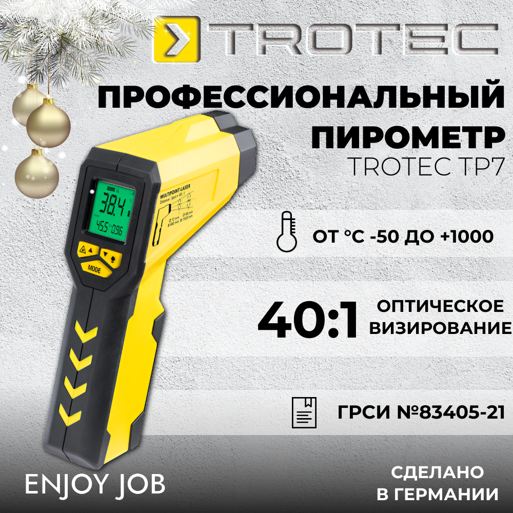 Trotec это инфракрасный пирометр для бесконтактного измерения температуры поверхности. Для удобства в устройства целенаведения в прибор интегрирована лазерная указка.Для получения более точного результата измерения можно настроить эмиссионную способность измеряемого материала. Для измерения температуры на устройстве можно настроить произвольно задаваемые пороговые значения. Выход за предварительно выбранные пороговые значения сигнализируется как с помощью акустической функции сигнализации, так и с помощью изменения цвета дисплея.Прибор оснащен подсветкой дисплея.