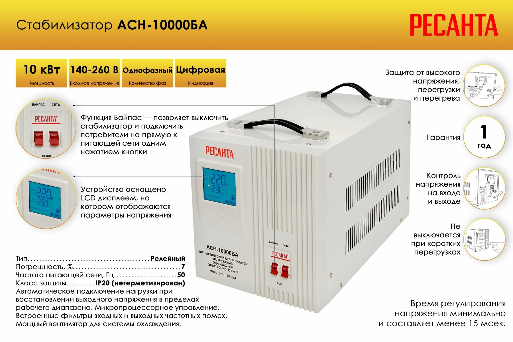 | Особенности | Удобный контроль, защита внутренних элементов, автоматическое отключение нагрузки, автоматическое подключение нагрузки, функция Байпас. |