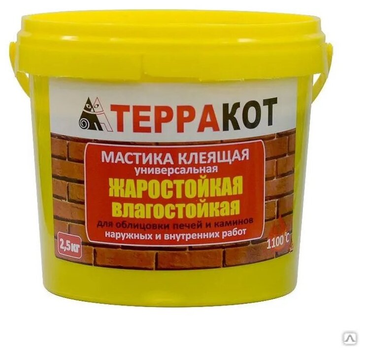 Жаростойкость мастики Терракот составляет 1100 градусов Цельсия, продукция не имеет запаха, не летуча, не требует проветривания рабочих помещений, является надежным долговечным клеящим бактерицидным и жаростойким материалом.