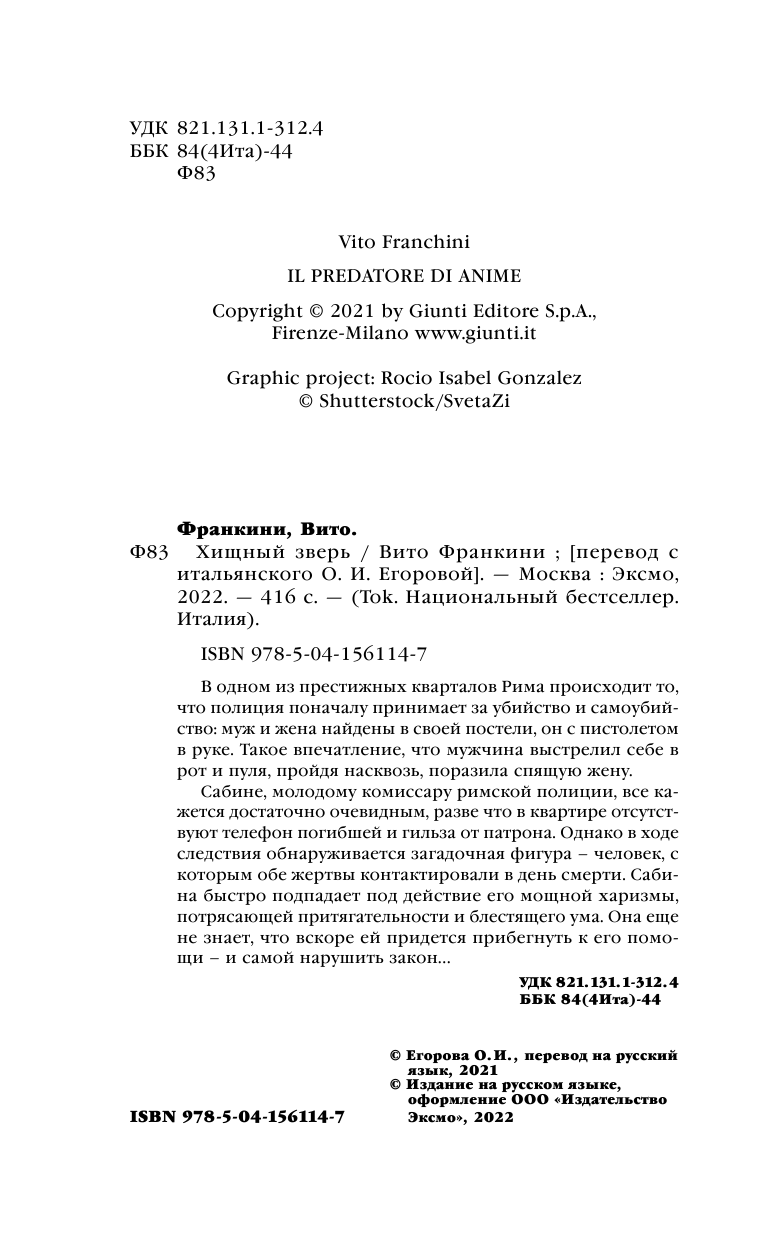 Книга: Хищный зверь (Вито Франкини); Эксмо, Inspiria, Редакция 1, 2021