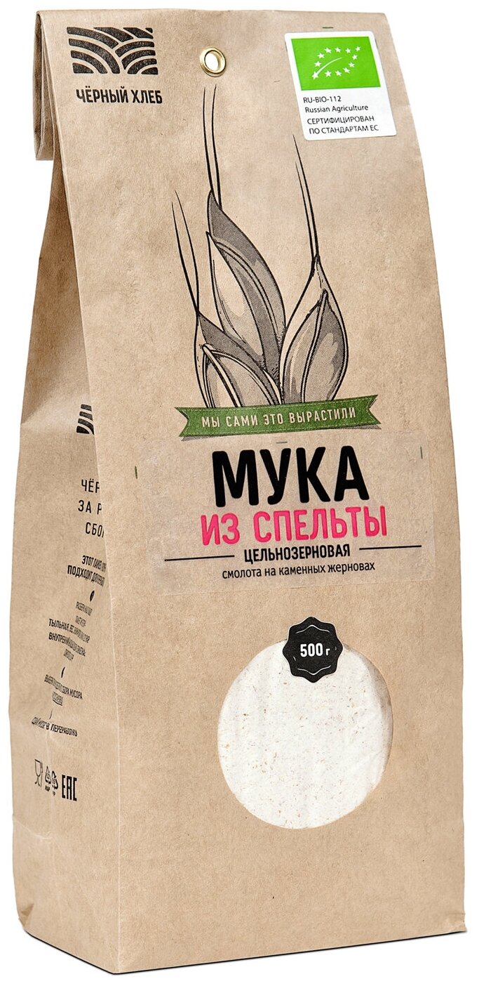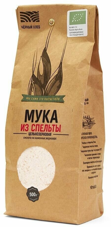 При производстве цельнозерновой муки из спельты мы смалываем цельные зёрна этой древней культуры на мельнице с каменными жерновами, а затем рассеваем через сито с диаметром ячейки 1,12 мм. Таким образом, мука сохраняет в себе все части зерна (кроме самых крупных отрубей) и максимум полезных веществ: питательный эндосперм, богатый витаминами зерновой зародыш и содержащие клетчатку отруби. Помимо пользы для здоровья, цельнозерновая мука из спельты Чёрный хлеб обладает ярким вкусом и красивым оттенком. Она отлично подходит для изготовления блинов, оладьев, пирожков, лепешек, сырников, теста для пиццы и пасты, печенья и другой сладкой выпечки. При изготовлении хлеба белую муку можно смешать с цельнозерновой это сделает хлеб более плотным, ароматным и полезным. Спельту люди начали возделывать задолго до нашей эры. Это дикая форма пшеницы, близкая по свойствам к её мягким сортам. Спельта наряду с полбой рекордсмены среди злаков по содержанию белка, жирных кислот, клетчатки, минералов и антиоксидантов. Блюда из спельты рекомендованы диетологами для детской кухни. Важно отметить, что у людей, имеющих непереносимость глютена пшеницы, непереносимости глютена спельты может не быть.