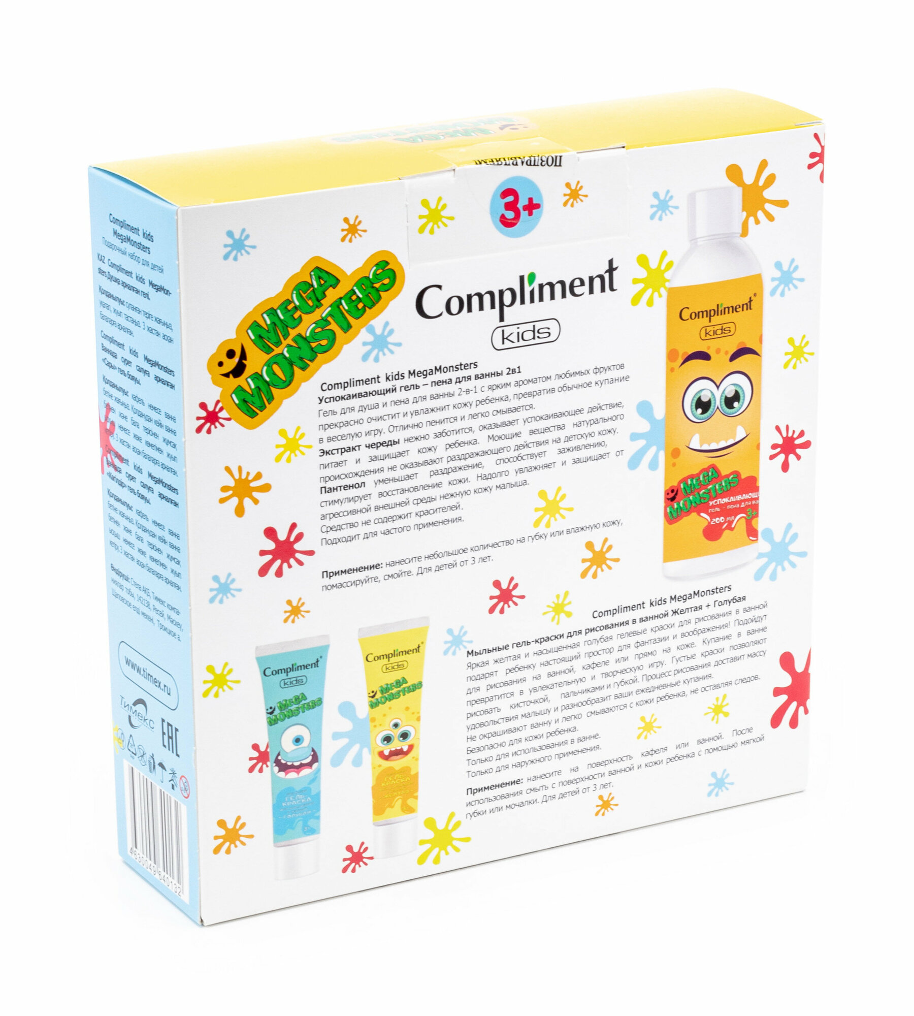 Набор подарочный Compliment Kids Megamonsters Гель-пена для ванны + Краска для ванн голубая + Краска для ванны желтая Утконос