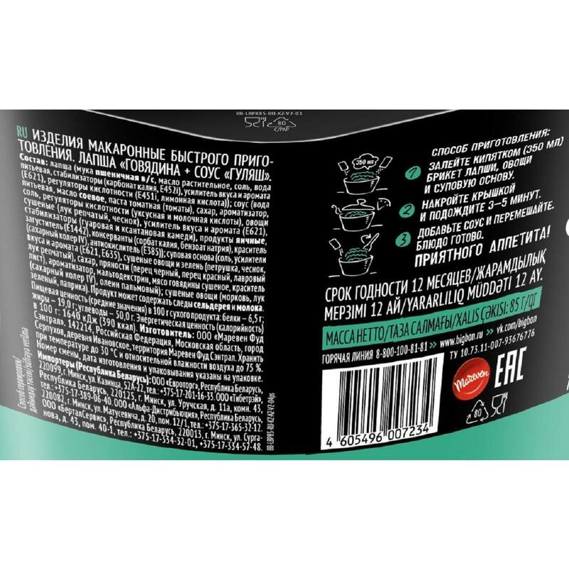 Лапша Big Bon говядина с соусом Гуляш 85г Маревен фуд сэнтрал