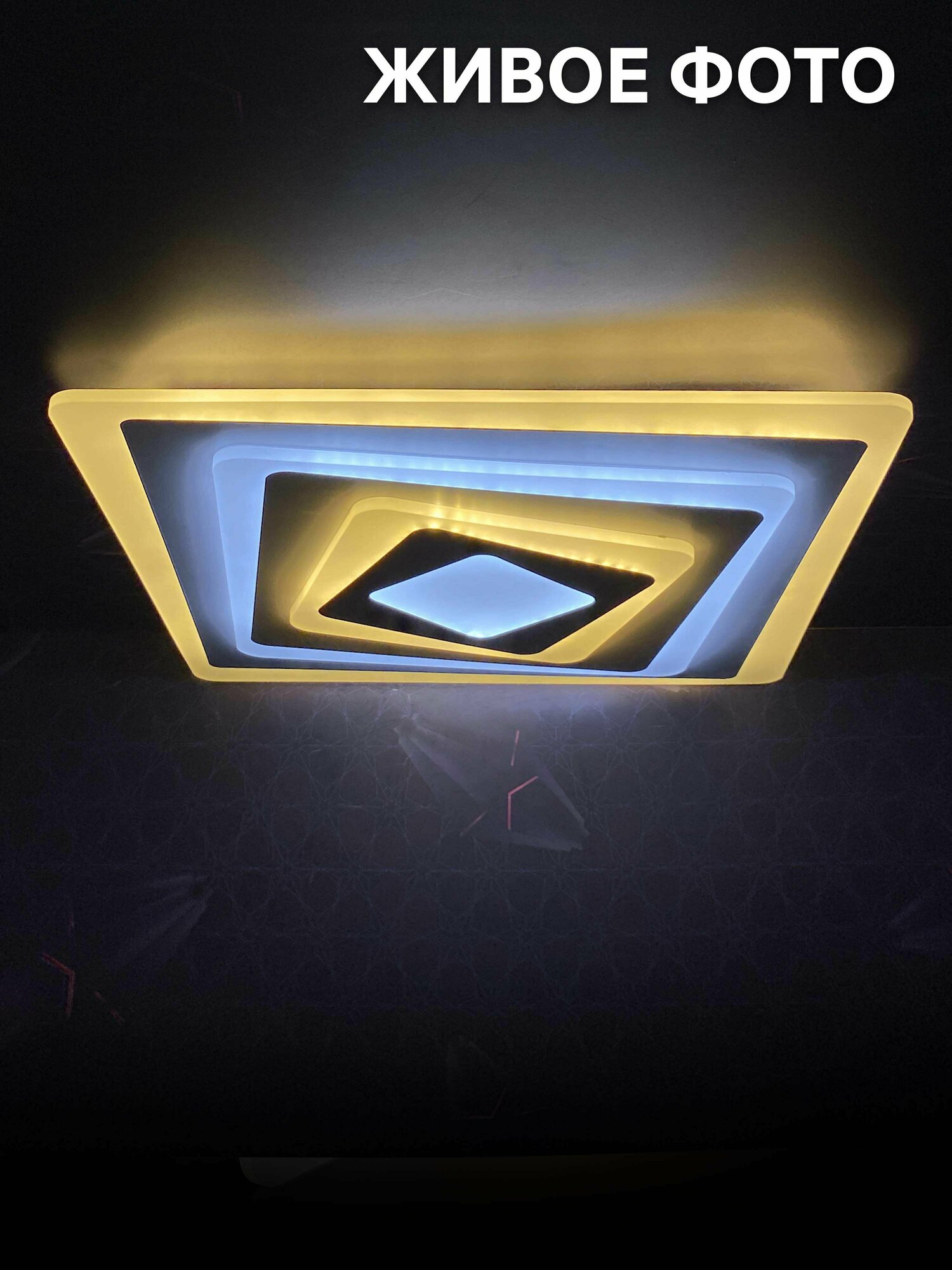 Люстра потолочная с диммером «Квадратная 05» 52224 9 размером 55,5 × 8,5 × 55,5 см оснащена встроенными светодиодами и управляется с помощью пульта ДУ. Крепление на планку дает возможность повесить люстру вплотную к потолку, а дизайнерский стиль устройства — придать уникальности интерьеру помещения.