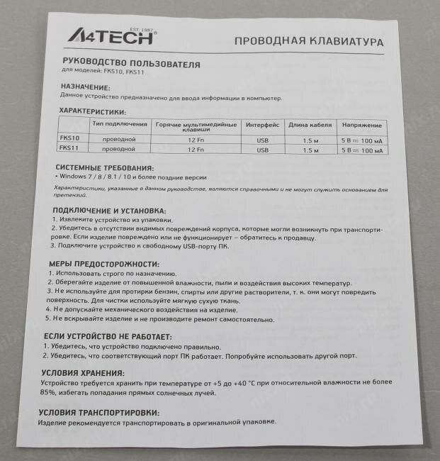 | Комплект поставки | Клавиатура, документация |