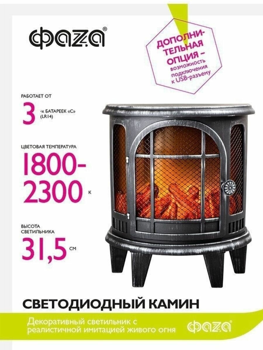 Оригинальный светильник с реалистичной имитацией живого огня, станет прекрасным дополнением любого интерьера. Зимой в квартире или офисе, летом на даче светильник добавит особую атмосферу уюта и тепла.Автономность питания позволяет располагать светильник в помещении без привязки к электрической розетке.Габариты, см: 31,7 х 27,3 х 14,6;Безопасен в эксплуатации, нет дыма и копоти, нет открытого огня.Выполнен с использованием современных светодиодных технологий, благодарю чему потребляет малое количество энергии.Питание осуществляется от 3-х батареек типоразмера «С» (не входят в комплект поставки).Дополнительная опция - возможно подключение камина к внешнему источнику питания 5В постоянного тока (USB-порт компьютера, USB-адаптер, USB-выход пауэр бэнка и т. п.). В комплект входит кабель подключения к USB-разъему длиной 1 м.Материал корпуса - полистирол.Класс пылевлагозащиты: IP20.