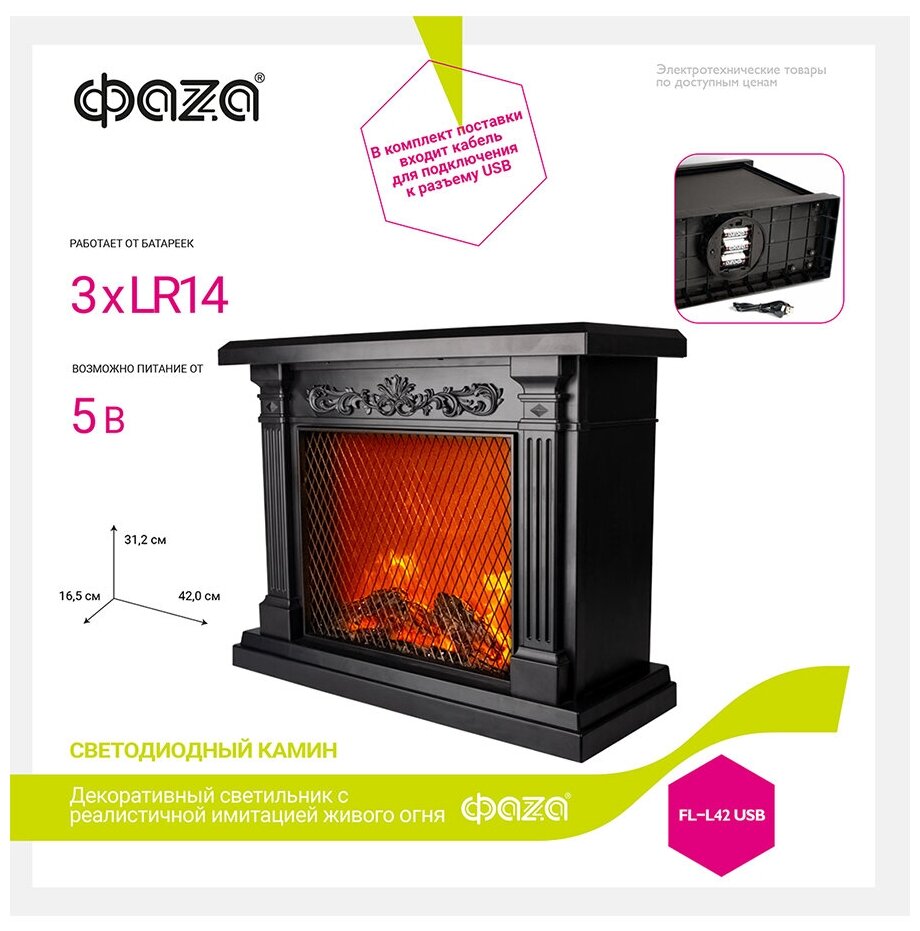 Оригинальный светильник с реалистичной имитацией живого огня, станет прекрасным дополнением любого интерьера. Зимой в квартире или офисе, летом на даче светильник добавит особую атмосферу уюта и тепла. Автономность питания позволяет располагать светильник в помещении без привязки к электрической розетке. Безопасен в эксплуатации, нет дыма и копоти, нет открытого огня. Выполнен с использованием современных светодиодных технологий, благодарю чему потребляет малое количество энергии. Дополнительная опция - возможно подключение камина к внешнему источнику питания 5В постоянного тока (USB-порт компьютера, USB-адаптер, USB-выход пауэр бэнка и т.п.). В комплект входит кабель подключения к USB-разъему длиной 1 м. Питание осуществляется от 3-х батареек типоразмера "С" (не входят в комплект поставки).Габариты светильника - 42 х 31,2 х 16,5см.