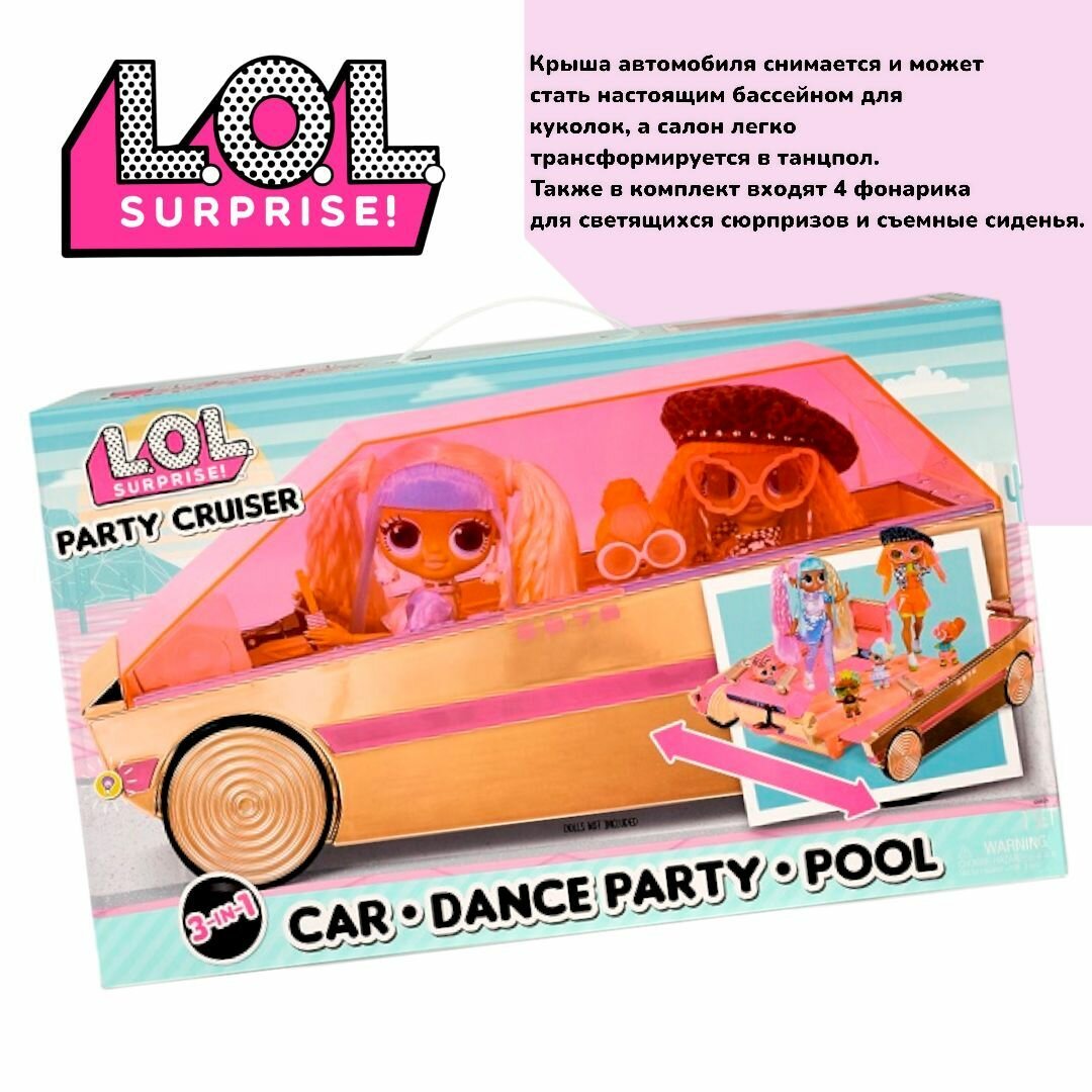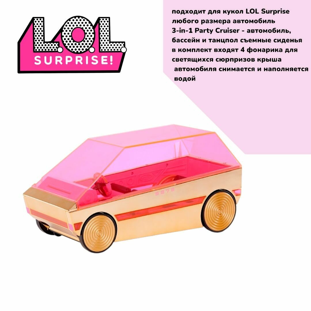 Крутой автомобиль 3-в-1 Party Cruiser для куколок LOL Surprise с бассейном-сюрпризом и танцполом. В автомобиле достаточно места, чтобы вместить 4 модных куклы OMG! Благодаря стильному, роскошному цвету Rose Gold и розовой отделке Party Cruiser выглядит потрясающе для любого случая!