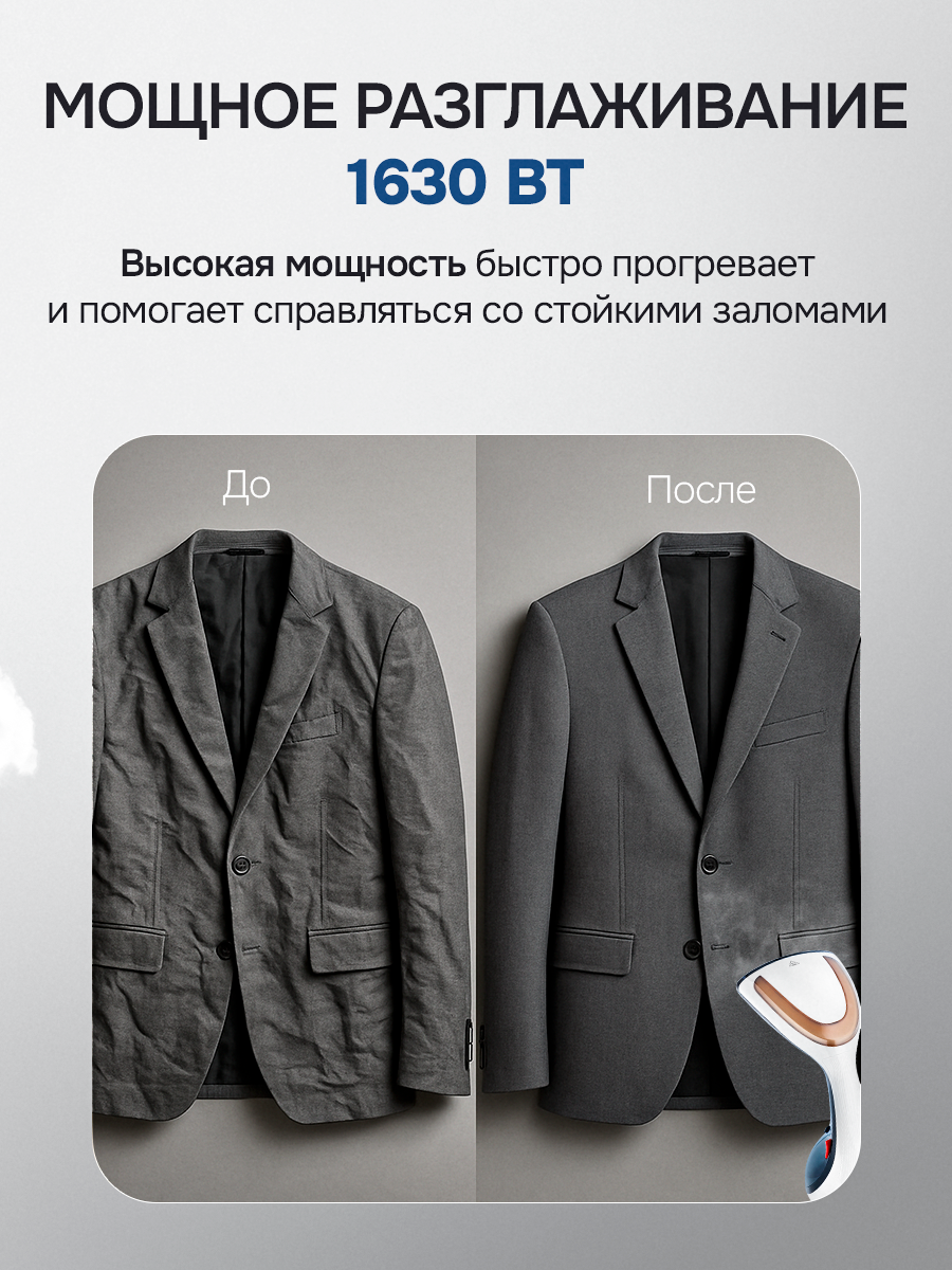 Максимальная мощность: 1630 Вт. Поверхность из нержавеющей стали. Постоянный пар: 25 г/мин. Готовность к работе через 35 секунд. Вертикальное отпаривание. Съемный резервуар для воды 270 мл. Длина шнура: 2 м.