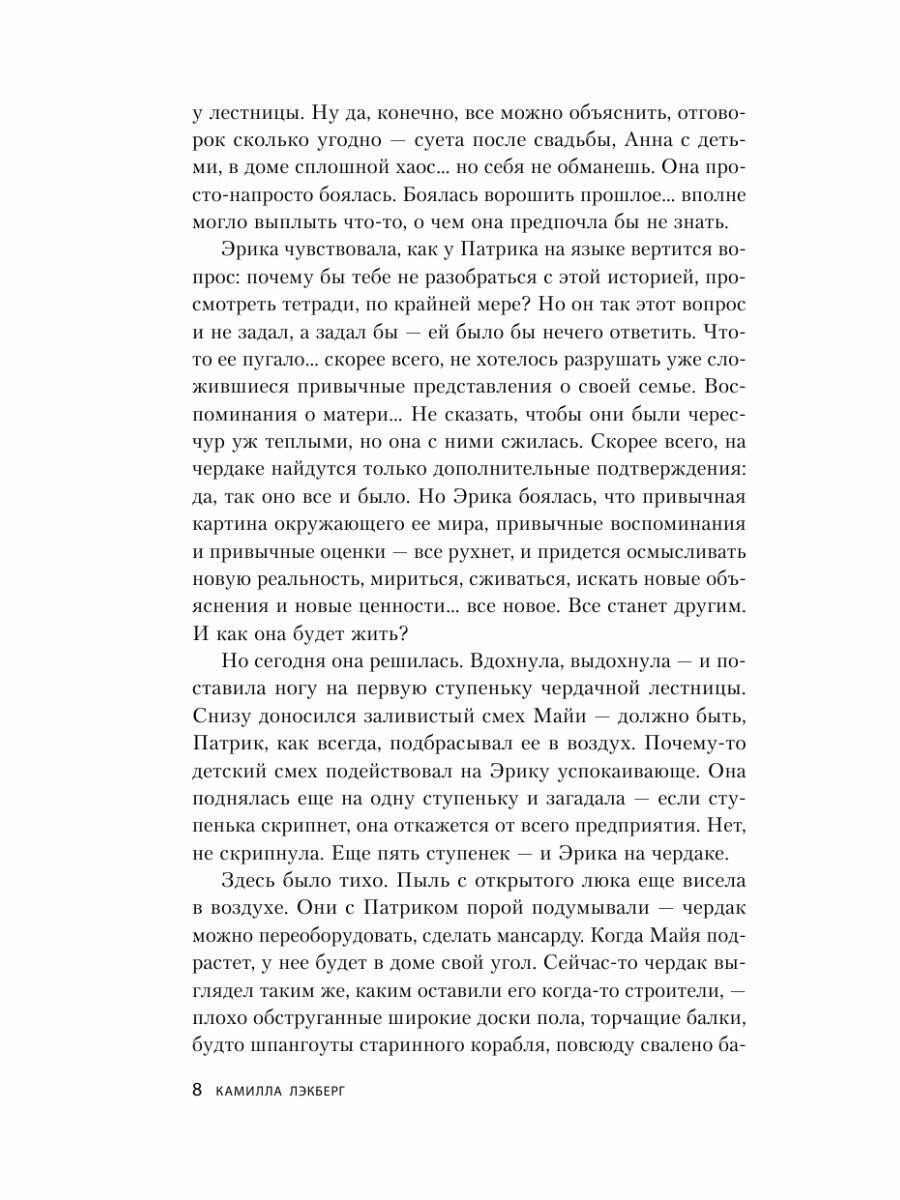 Книга очень интересная.Но претензия скорее к издательству.Эта книга 5 из серии о Эрике Фальк,а не 4 ,как заявлено издательством.Закончила читать Вкус пепла,начала следующую и понимаю,что нет целого периода жизни героев.Вот такая накладочка.После книги Вкус пепла нужно читать Запах соли,крики птиц.
