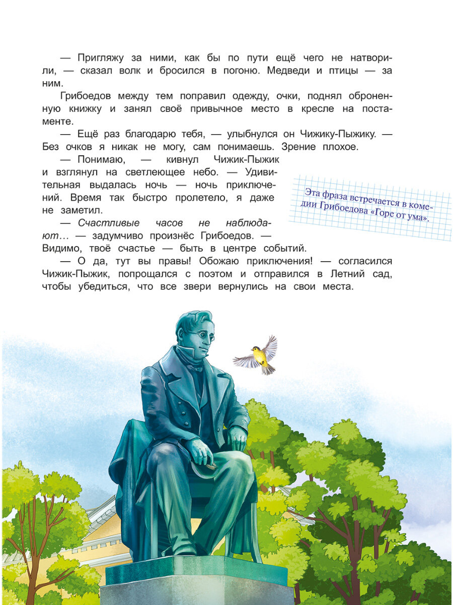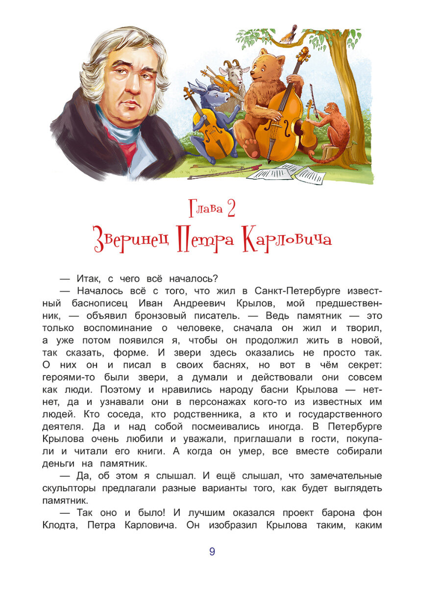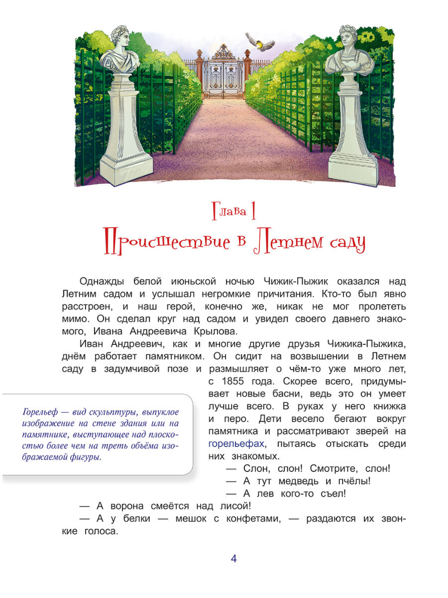 Чижик-Пыжик, большой эрудит и знаток Петербурга, снова в гуще событий! На этот раз его помощь потребовалась классику русской литературы Ивану Андреевичу Крылову, которого подвели подопечные: хвостатые, лохматые, пернатые, а ещё очень любознательные и разговорчивые… Белая ночь коротка, но Чижик в роли петербургского Шерлока Холмса успеет облететь весь центр Северной столицы и найти разгадку произошедшего в Летнем саду. Итак, Чижик начинает расследование…