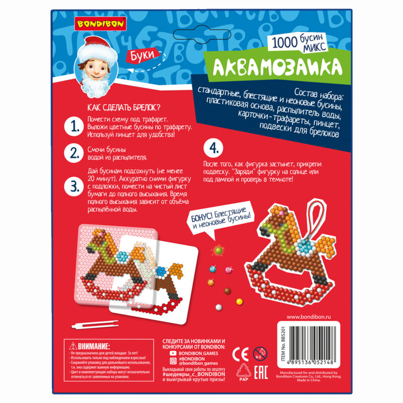 В набор входят стандартные, блестящие и неоновые бусины, пластиковая основа, распылитель воды, карточки-трафареты, пинцет и подвеска для брелоков. Рекомендуемый возраст для игры 5+ под присмотром взрослых.
