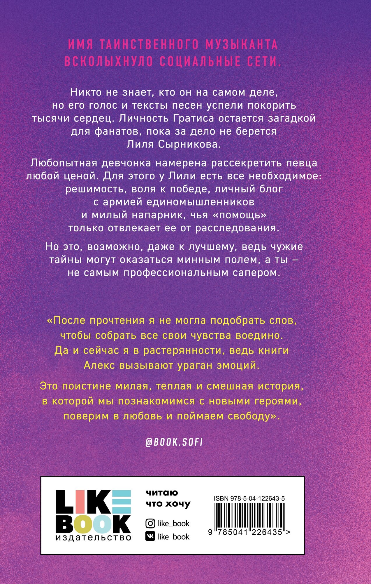Героиня блогер с сотнями тысяч подписчиков, и хоть нам до неё далеко, но почитать об этом было приятно. То как она пыталась узнать личность певца было невероятно интересно. Расследование, помощь неожиданного друга, да и самих подписчиков. Эмоции от истории через край - была легкая грусть, много смеха, любовь и испытания.