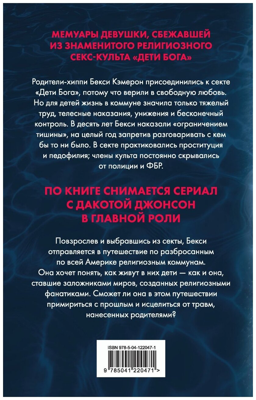 У книги привлекающая внимание обложка с тонущей девушкой и броский слоган. Книгу написала девушка, которая родилась и выросла в одной из самых крупных и жестоких сект Америки "дети Бога" - Бекси Кэмерон.