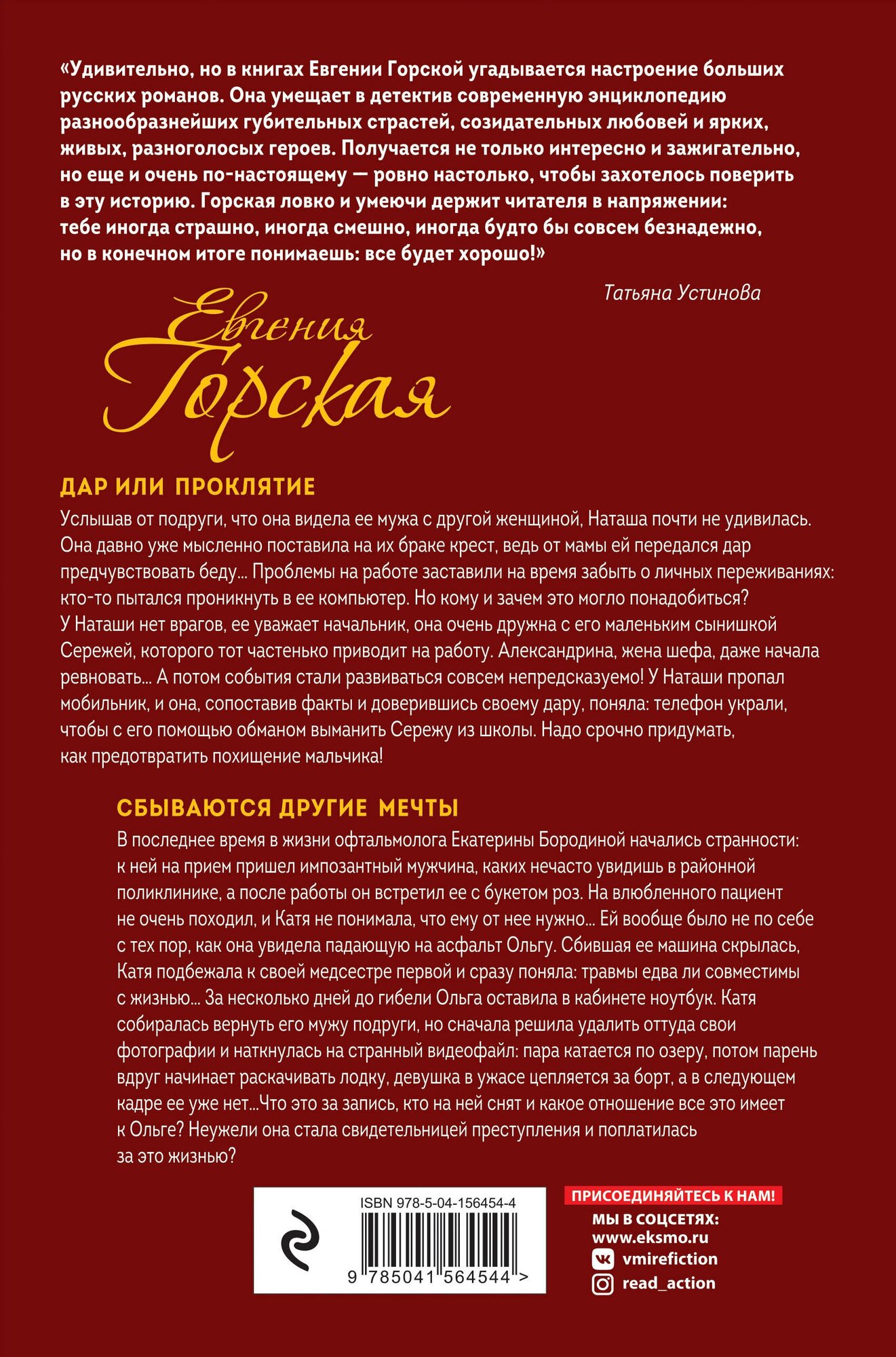 "Евгении Горской в ее новой книге "Дар или проклятие" удалось совместить два на первый взгляд несовместимых компонента: идеальный детектив и гнетущий саспенс. В результате получился яркий, безумно вкусный и мгновенно опьяняющий коктейль из кристально чистой логики и вихря неподдельных эмоций. Казалось бы, практически невозможно написать книгу, действие которой только нарастает, петля сюжета затягивается все туже, самые сильные эмоции - любовь и ненависть - бьют через край, а история на каждом витке совершает головокружительный кульбит, переворачивая все с ног на голову, заставляя героев искать спасения там, где спасение, кажется, невозможно. Но Евгении Горской это удалось!.."