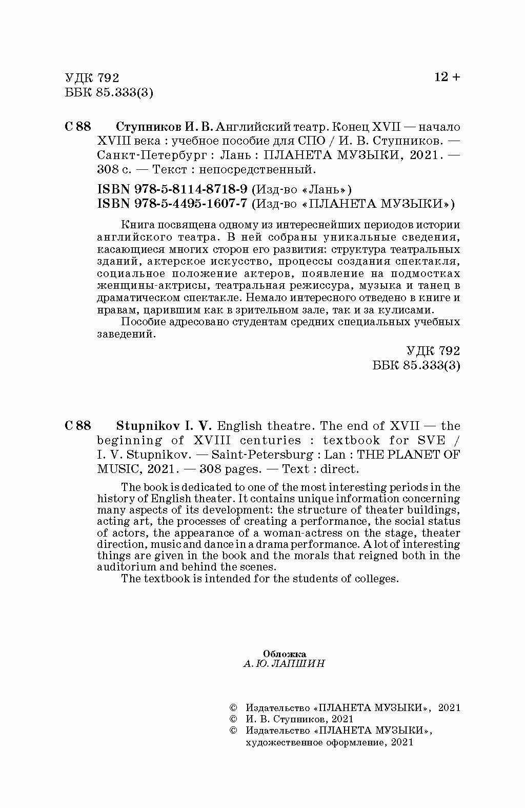 Английский театр. Конец XVII – начало XVIII века. Учебное пособие для СПО (И. В. Ступников); Издательство «Планета музыки», 2021
