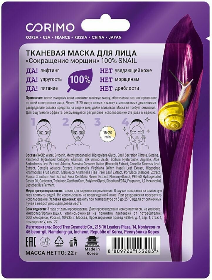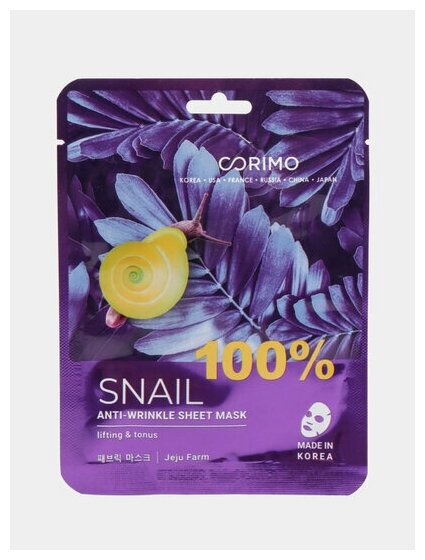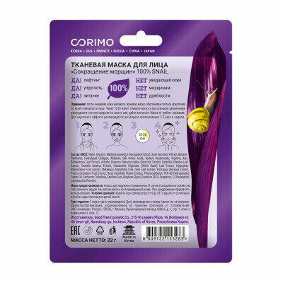 Маска для лица Corimo Snail 100% Сокращение морщин 22г Good Tree