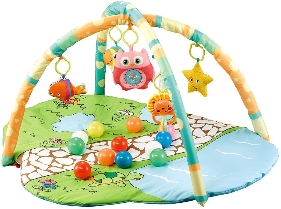 Комплектация: коврик, 2 дуги, домик, 5 подвесок-игрушек, 30 мячиков.