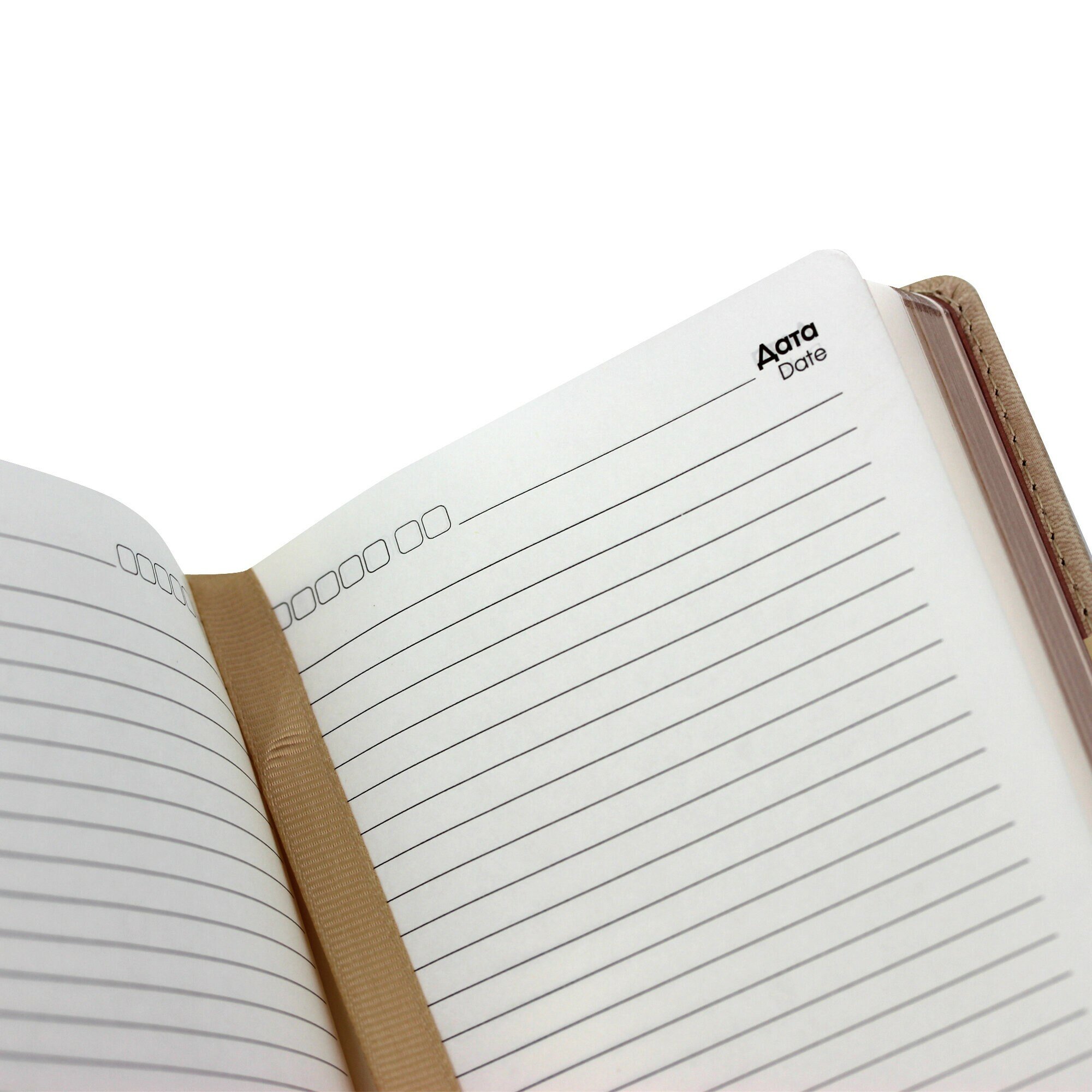 Ежедневник недатированный Etude 1 в индивидуальной упаковке. По цвету светло-кремовый, но не желтый. Оформлен с фольгированными вставками с закладкой-ленточкой. 156 листов светло-кремового цвета с отдельными страницами с личной информацией, календарями, планированием проектов и контактами. Печать четкая, по размеру в закрытом виде, примерно, 10 см. в ширину и 15 см. в высоту.