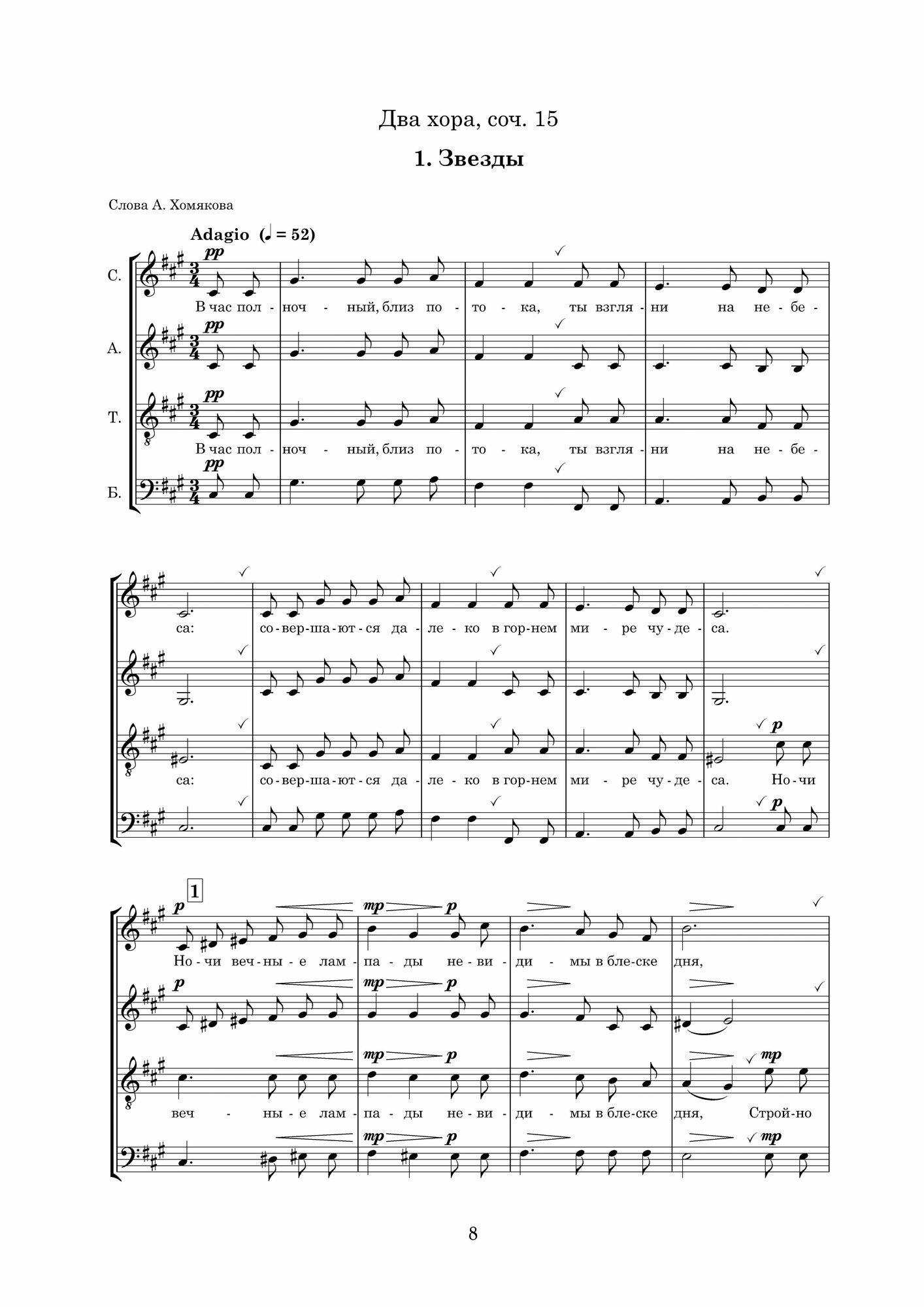 Область хоровой музыки стала для Сергея Ивановича Танеева наиболее близкой, полностью отвечая его музыкально-эстетическим устремлениям. Композитор создал около сорока хоровых сочинений для исполнения без сопровождения, а также около десяти вокальных ансамблей, предназначенных в том числе для исполнения хором. В настоящий сборник вошли наиболее репертуарные опусы Танеева — Два хора соч. 15 («Звезды», «Альпы») и непревзойденный цикл Двенадцать хоров на стихи Якова Полонского. Издание адресовано смешанным хоровым коллективам высших учебных заведений и профессиональным коллективам.