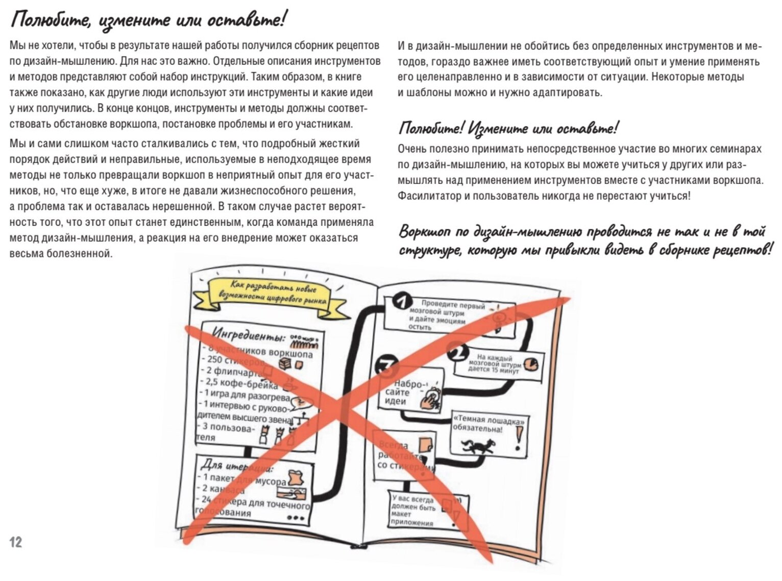 Книга необычного формата, а точнее дизайна, размер брошюры, однако сама книга не тонкая, в ней присутствует обилие цветных выделителей текста и небольших картинок, и это является лучшим ходом для того, чтобы заинтересовать ею покупателя, учитывая то, о чем она повествует. Главная цель дизайн-мышления - выйти за пределы привычных норм. Эта книга строится на базе опыта более 2500 опрошенных практиков дизайн-мышления, авторы изложили их фишки и инструменты, которых они придерживаются в своей работе. Так появилось это пособие с инструкциями и методами для дизайн мышления, а так же наглядными примерами по их использованию. Содержание книги строится на основе рождения идеи: понимание, наблюдение, определение точки зрения, поиск идей, прототипирование, тестирование и рефлексия. Каждая глава, а значит каждый этап создания, авторы разложили "по полочкам": от постановки задачи и ее понимания, до, как раз таки, предложения методов. Стоит отметить, что эта книга подойдет и совсем новичкам, поскольку не является просто перечислением инструкций от практиков, а содержит в себе подробное описание каждого процесса создания идеи.