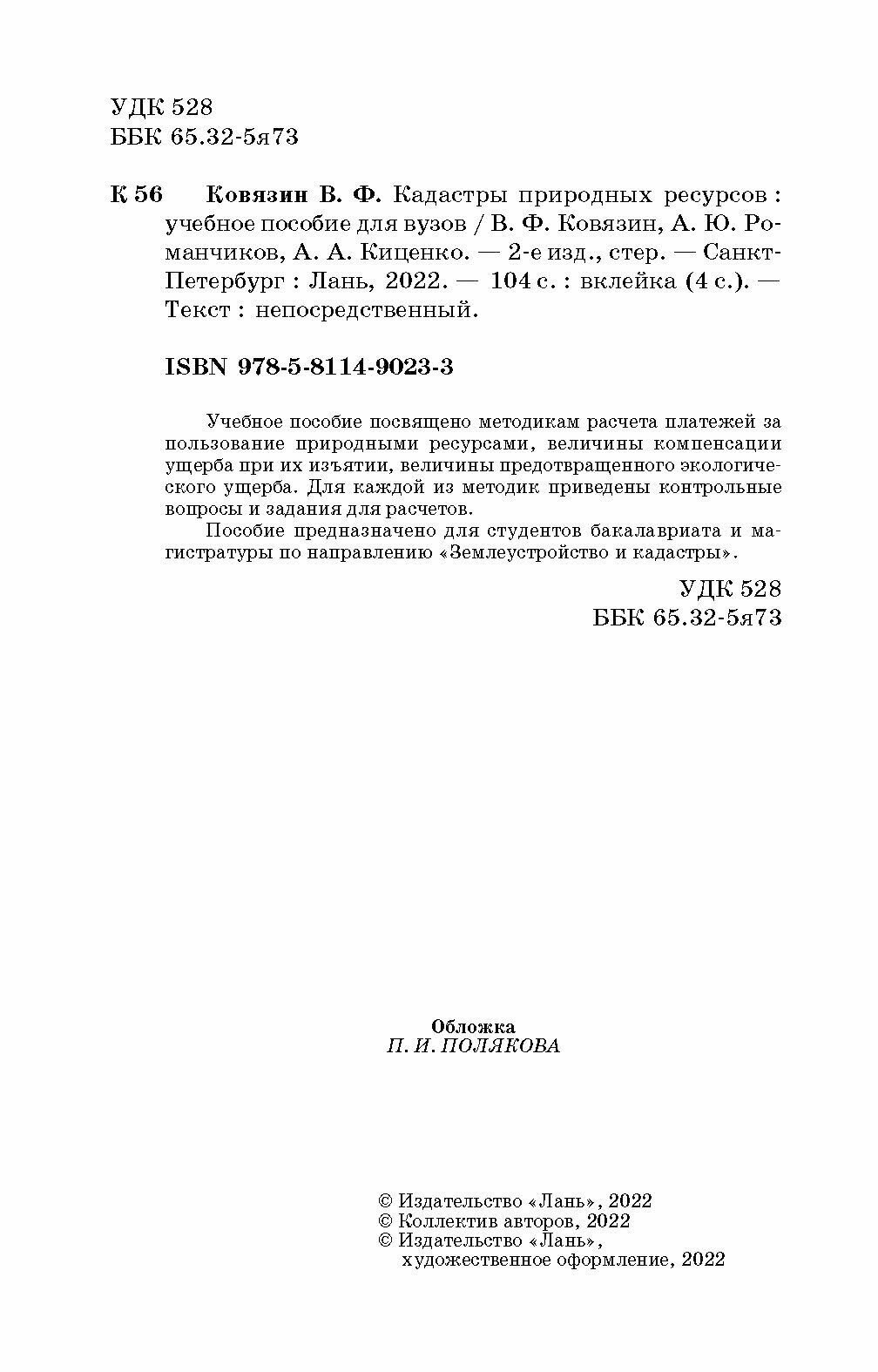 Кадастры природных ресурсов.Уч.пос.2изд (Ковязин Василий Федорович, Романчиков Алексей Юрьевич, Киценко Анастасия Анатольевна); Лань, 2022