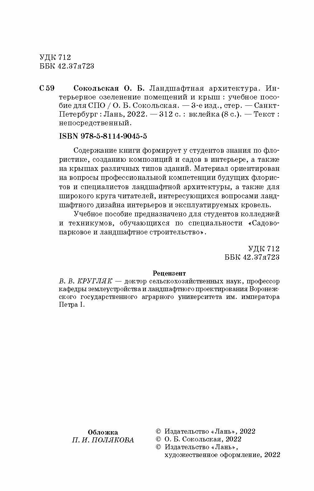 Ландшафтная архитектура.Интер.озелен.помещ.СПО.3из (О. Б. Сокольская); Издательство ЛАНЬ, 2022