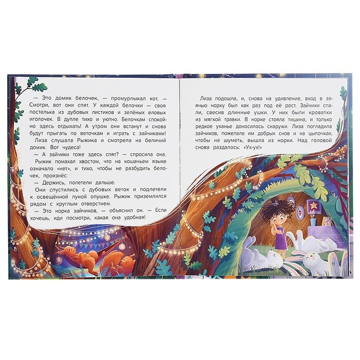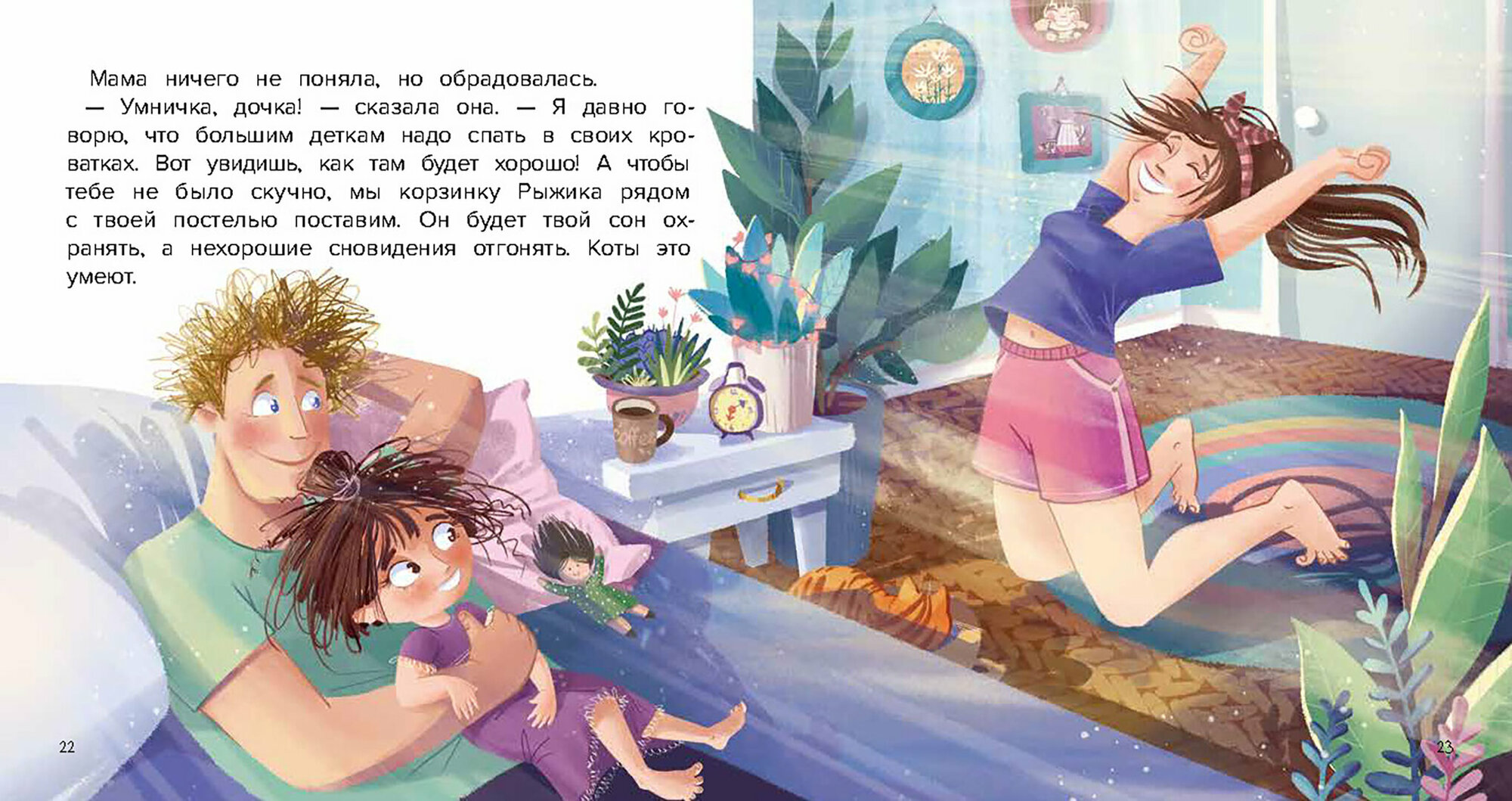 Сказка сама по себе интересная. О волшебном путешествии девочки со своим котом. НО... Задача книги - приучить ребёнка спать в своей кровати. С этой задачей история не справляется. Кот говорит героине, что все зверята спят в своих норках, гнёздышках и т.д. Смотрим внимательно на картинку, где спят детёныши. И что мы видим: все детёныши спят в своих норках, гнёздышках и т.д. ВМЕСТЕ С МАМОЙ. Ребёнок сразу на это обратит внимание! И зачем тогда героине спать одной, когда она также, как лисёнок, медвежонок, может спать рядом с мамой? Потом вдруг упоминание, что родители не высыпаются. А вот до этой мысли ребёнку надо дорасти.