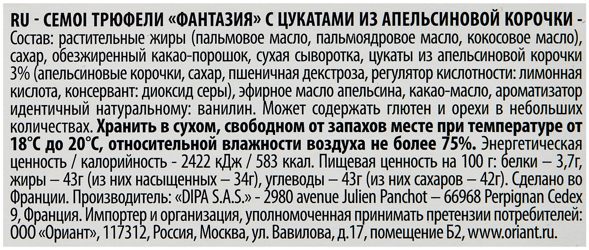 | Состав | растительные жиры (пальмоядровое масло, пальмовое масло), сахар, обезжиренный какао-порошок (13%), сухая молочная сыворотка, апельсиновые корочки 3% (апельсиновые корочки, сахар, декстроза, регулятор кислотности |