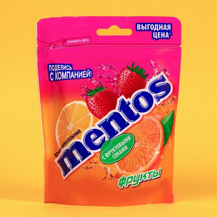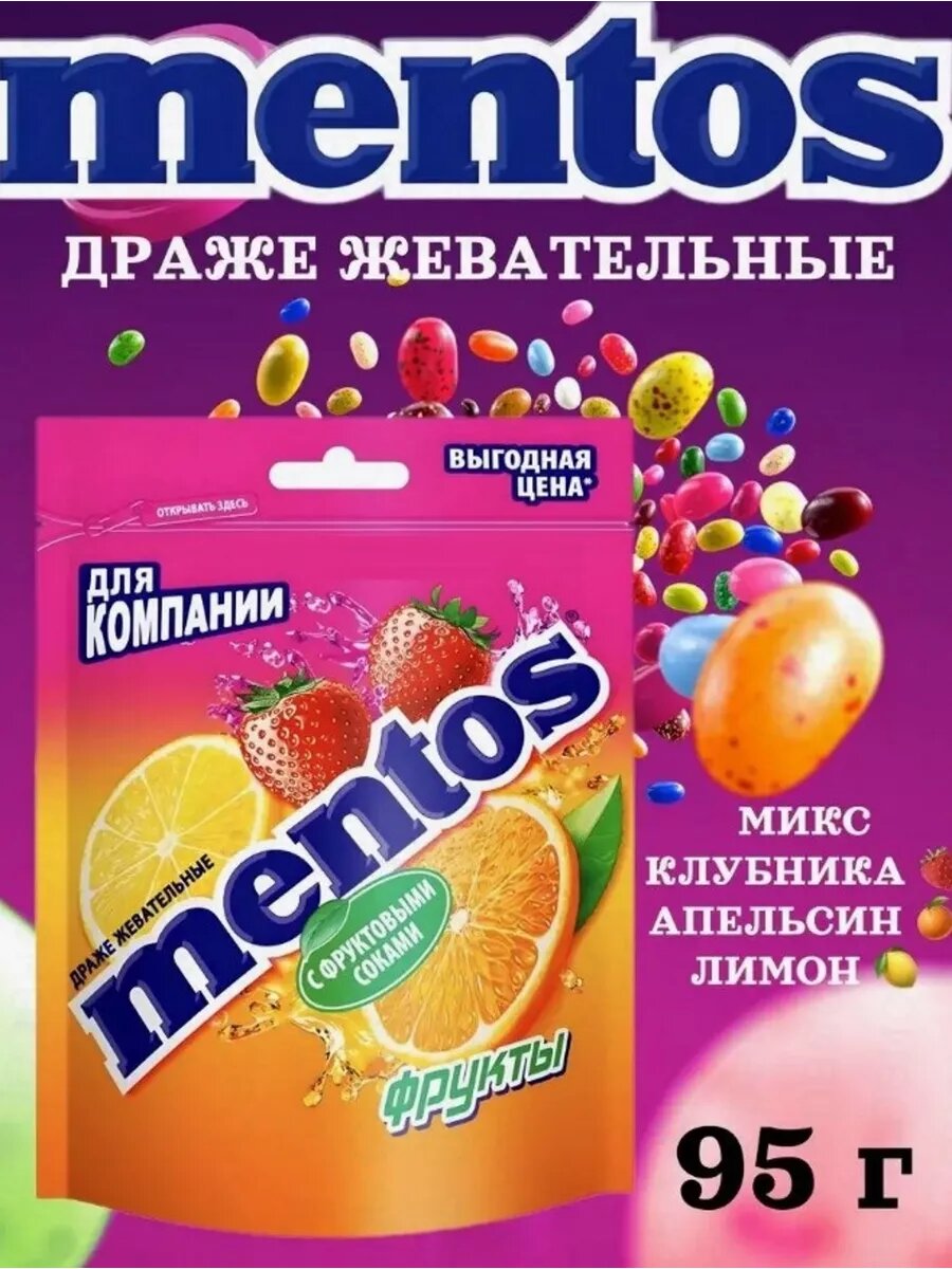Жевательные драже Mentos Фрукты – это сочетание драже с фруктовыми соками клубники, апельсина и лимона в одной упаковке! Дарит уверенность в себе и вдохновляет на свежие идеи. Конфеты удобно брать с собой: компактная упаковка легко помещается в сумке или рюкзаке.