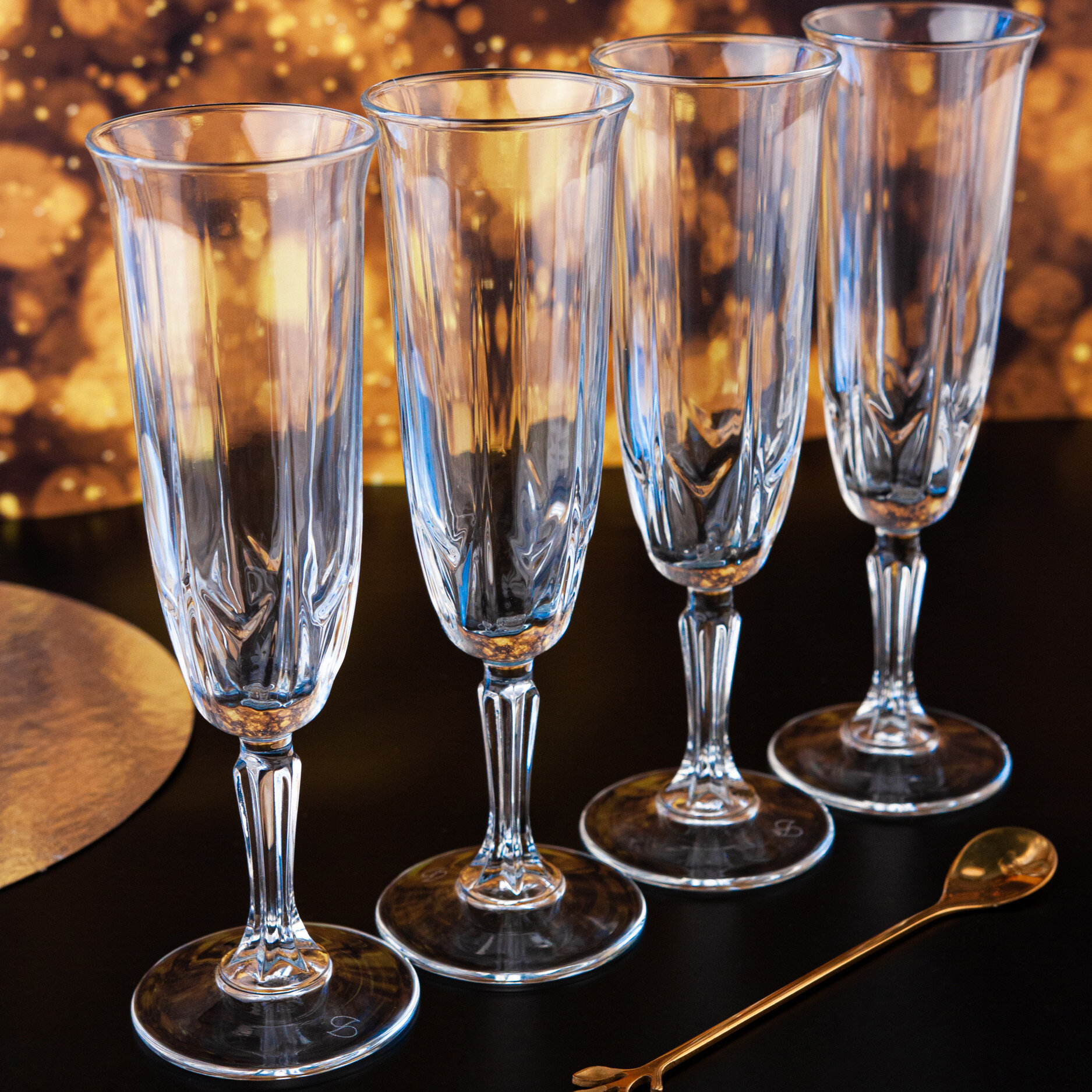 Бокалы имеют высоту 20,6 см и диаметр 6 см, что делает их удобными в использовании. Оформление модели рассчитано для подачи шампанского. Объем позволит поместить в него 163 мл игристого напитка. Бокалы изготовлены из закаленного стекла, поэтому они прочные и долговечные. Сквозь прозрачные стенки видно цвет напитка и игру пузырьков шампанского. Набор дает возможность: