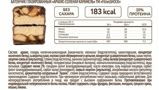 | Состав | Полидекстроза (пищевые волокна), глазурь молочно-шоколадная (какао-масло, изомальт (подсластитель), какао порошок, концентрат молочного белка, сыворотка сухая, молоко сухое обезжиренное и цельное, концентрат сывороточного белка, какао тертое, лецитин соевый (эмульгатор), стевиозид (подсластитель), ванилин (ароматизатор)), арахис, вода питьевая, смесь белков (концентрат сывороточного белка, концентрат молочного белка). Содержит менее 2%: Глицерин (агент влагоудерживающий), сорбит (агент влагоудерживающий), соль гималайская розовая, сорбат калия (консервант), соевый лецитин (эмульгатор), аскорбиновая кислота (регулятор кислотности), ароматизатор натуральный "Арахис", cтевиозид (подсластитель). |