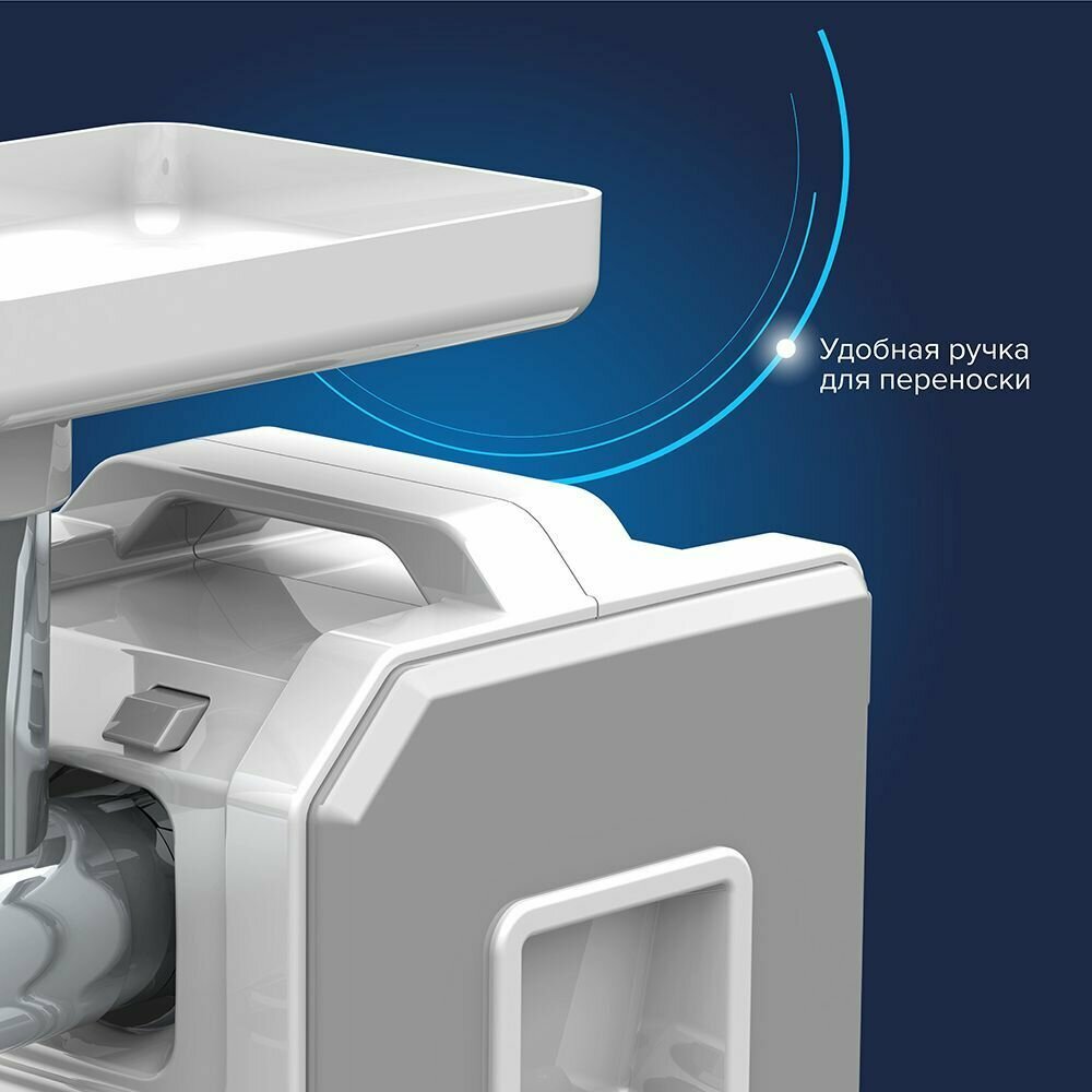 Удобство использования: наличие ручки для переноски, разборной шнековой камеры и отсека для хранения насадок делает эксплуатацию мясорубки легкой и комфортной.