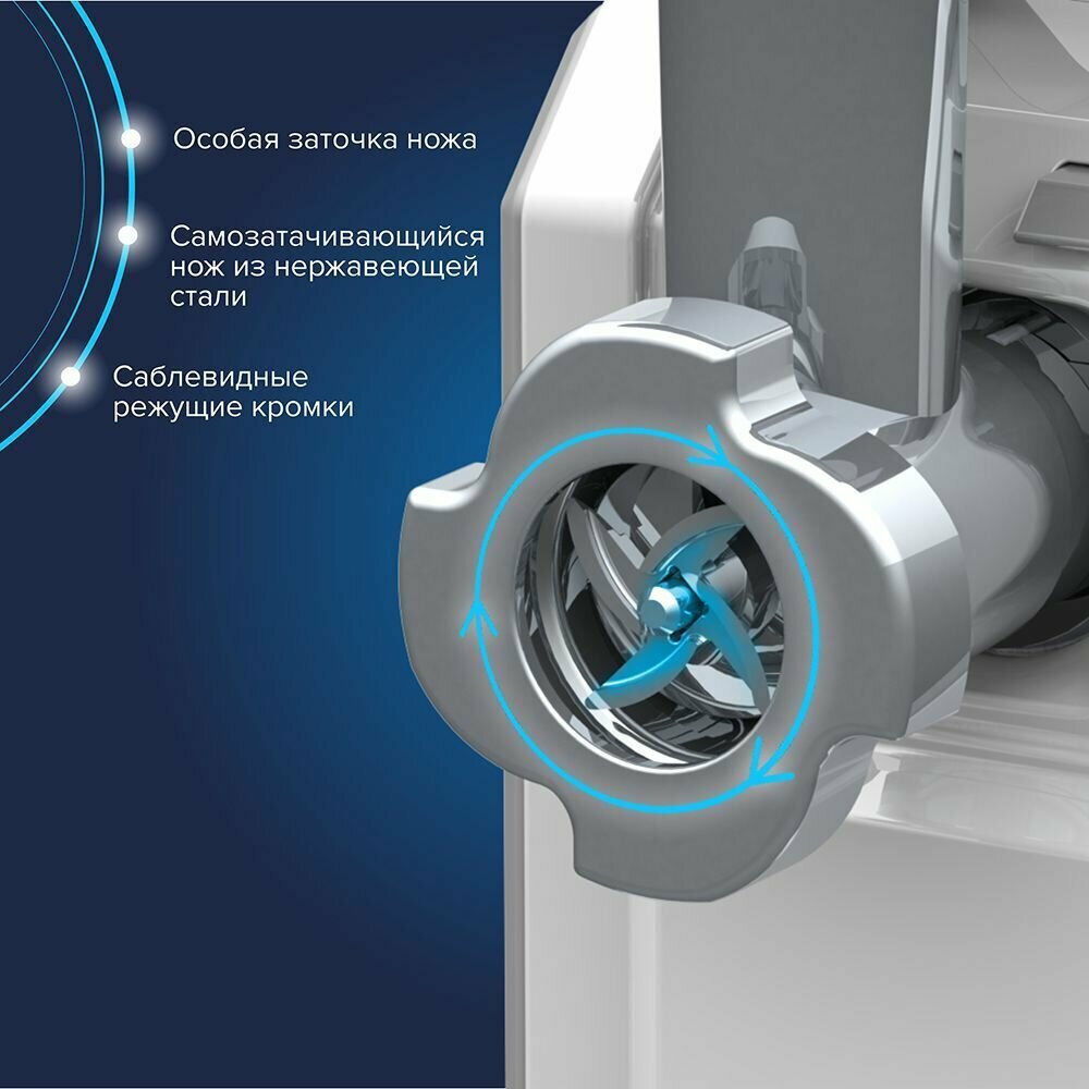 | Дополнительно | двойная защита от брызг, возможность вертикального хранения, диаметр отверстий решеток для фарша диаметром 4.9 мм и 7 мм |