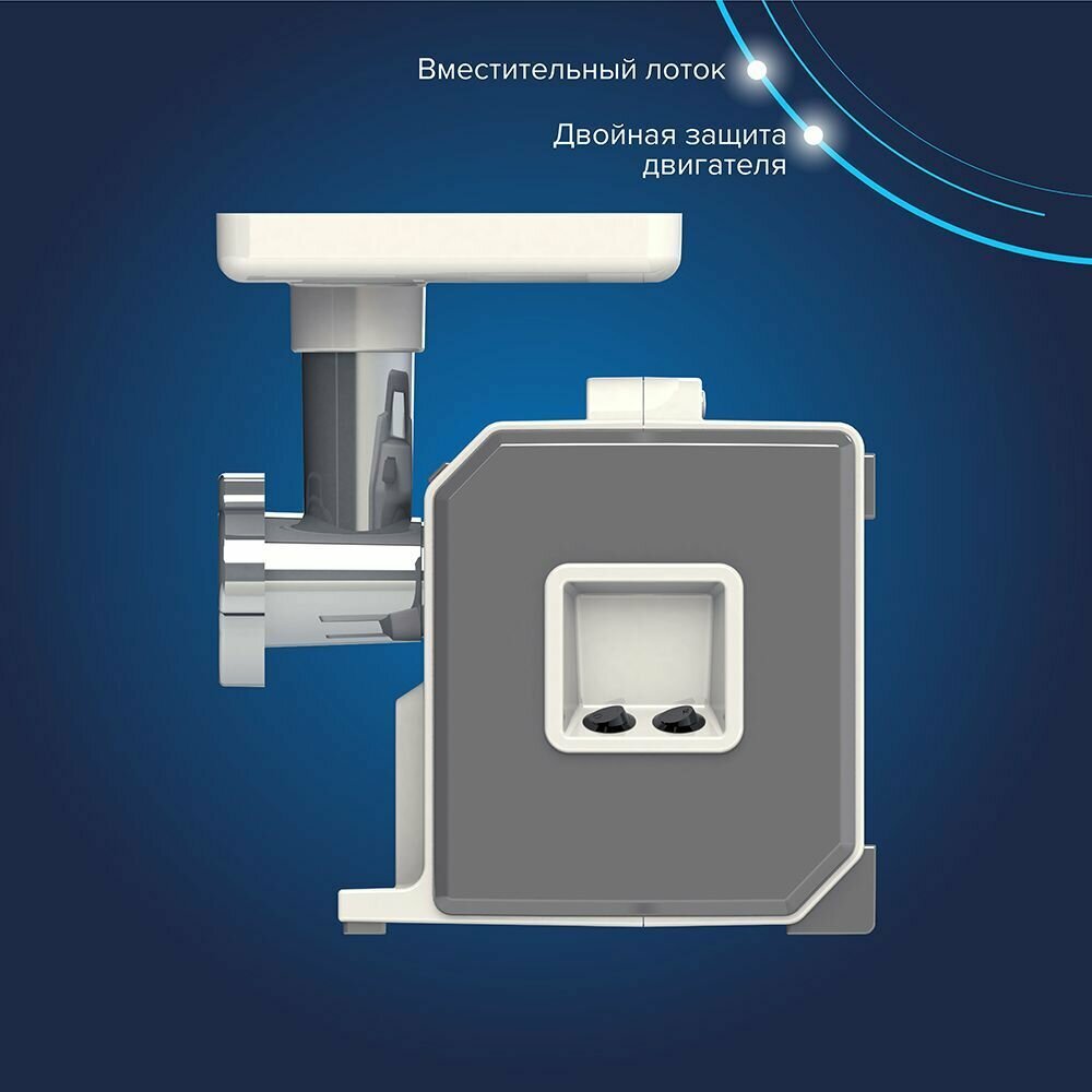 Защита двигателя от перегрузки обеспечивает безопасность эксплуатации и предотвращает поломки при сильном нажатии на мясо.